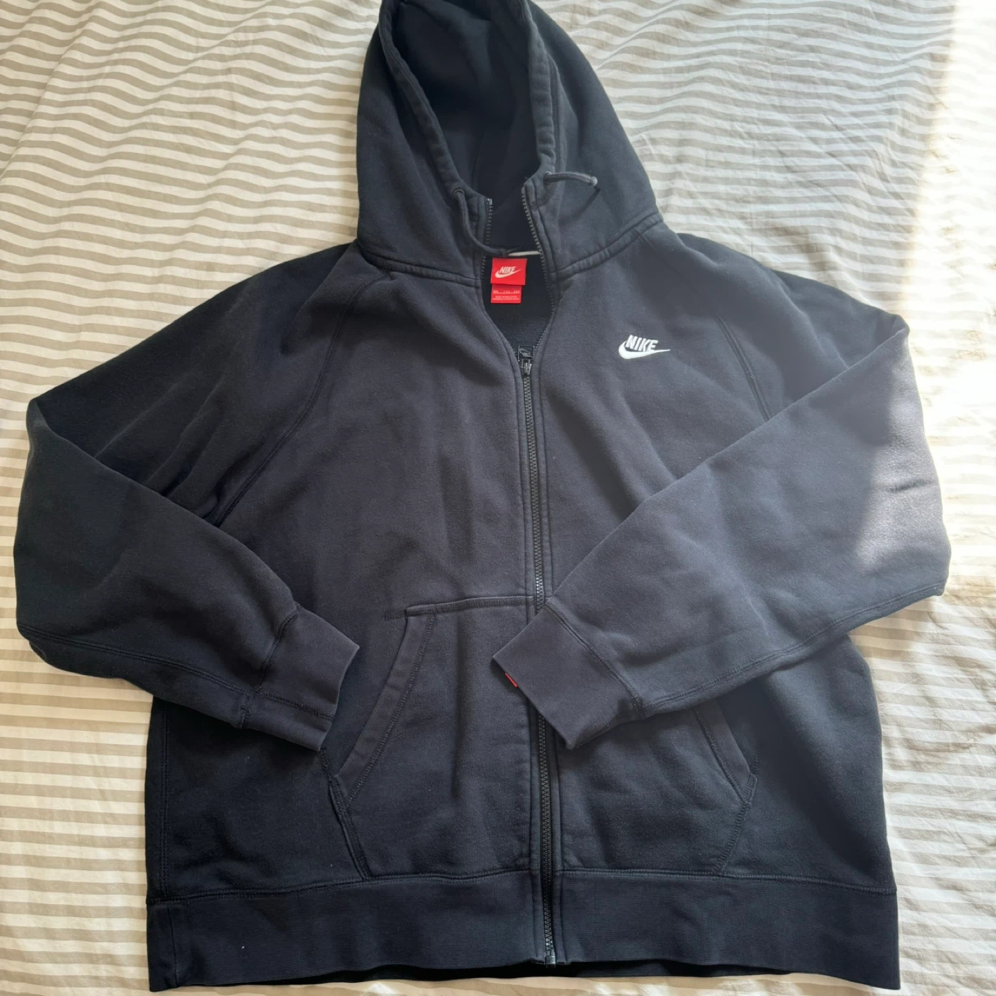 A black Nike full-zip hoodie. It's size XXL and made in Malaysia. This comfy hoodie is perfect for casual wear. A little faded