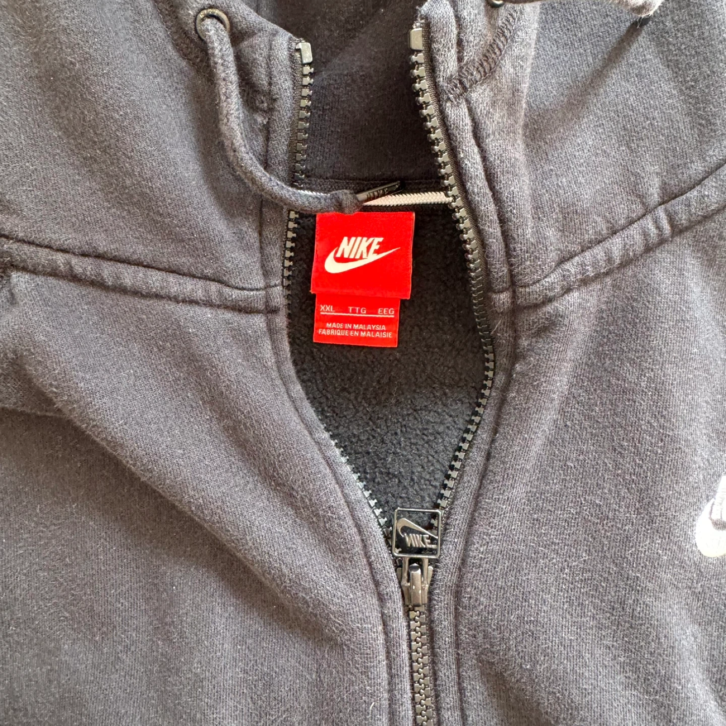 A black Nike full-zip hoodie. It's size XXL and made in Malaysia. This comfy hoodie is perfect for casual wear. A little faded