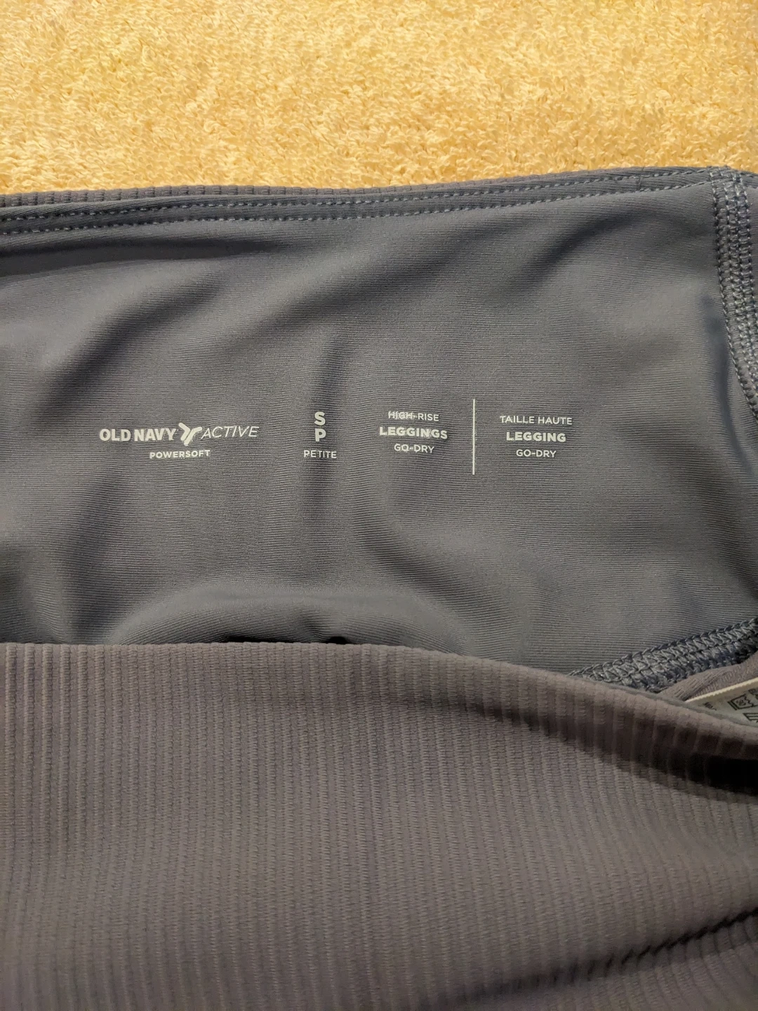 This set includes Old Navy Active PowerSoft ribbed high-waist leggings and bike shorts. The ribbed leggings have side pockets. One pair is grey (size small petite) and the other is black (size small regular). The bike shorts are size small and have a back waist pocket. Each pair have only been worn once.