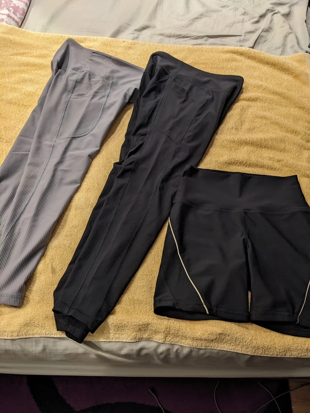 10 dollars for each pair of leggings, 7 dollars for the shorts. Take all three for 20 dollars.