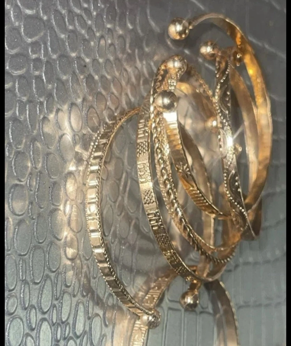 This is a set of five rose gold bangles with intricate embossed patterns. They feature a classic design with decorative ends. These bangles add a touch of elegance to any outfit. $10 per bangle, $45 for the bundle.