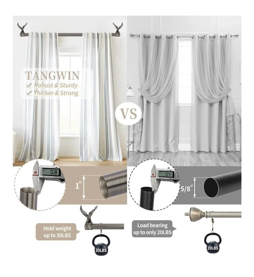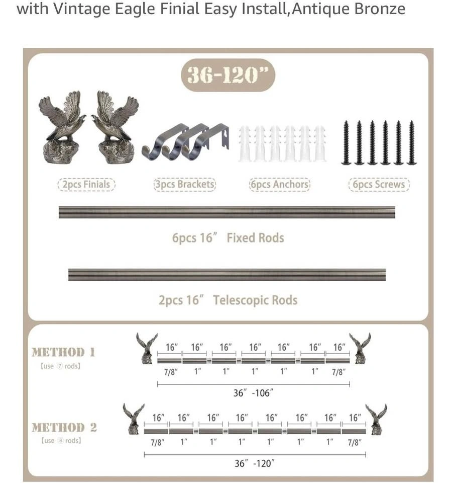 Brand new in box TANGWIN Bronze Decorative Curtain Rods for Windows, 66-120" adjustable. Heavy duty rustic drapery rods with vintage eagle finial. Easy install, antique bronze finish. Also available in gold colour.