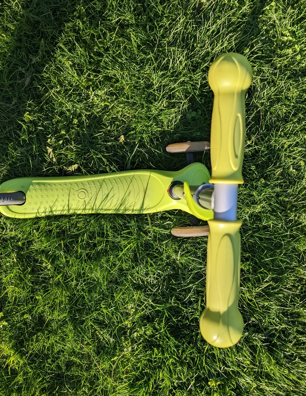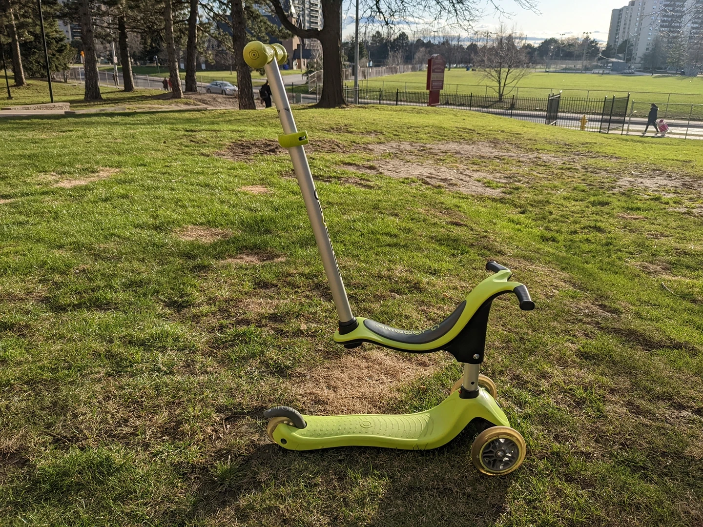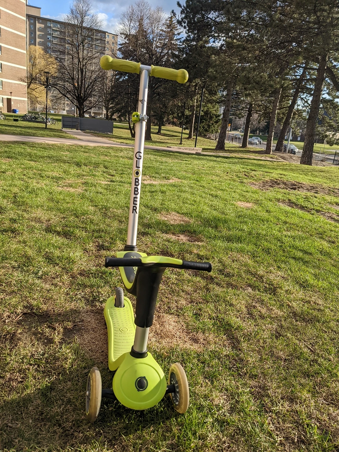 great condition. convertible scooter to push bike and balance bike. don't have the pic of it as a balance bike but you would just remove the stick / pole / bar that makes it a push bike. grows with your child. can use from 1.5 years and up. The scooter has 3 height adjustments. It retails for 130+ tax.