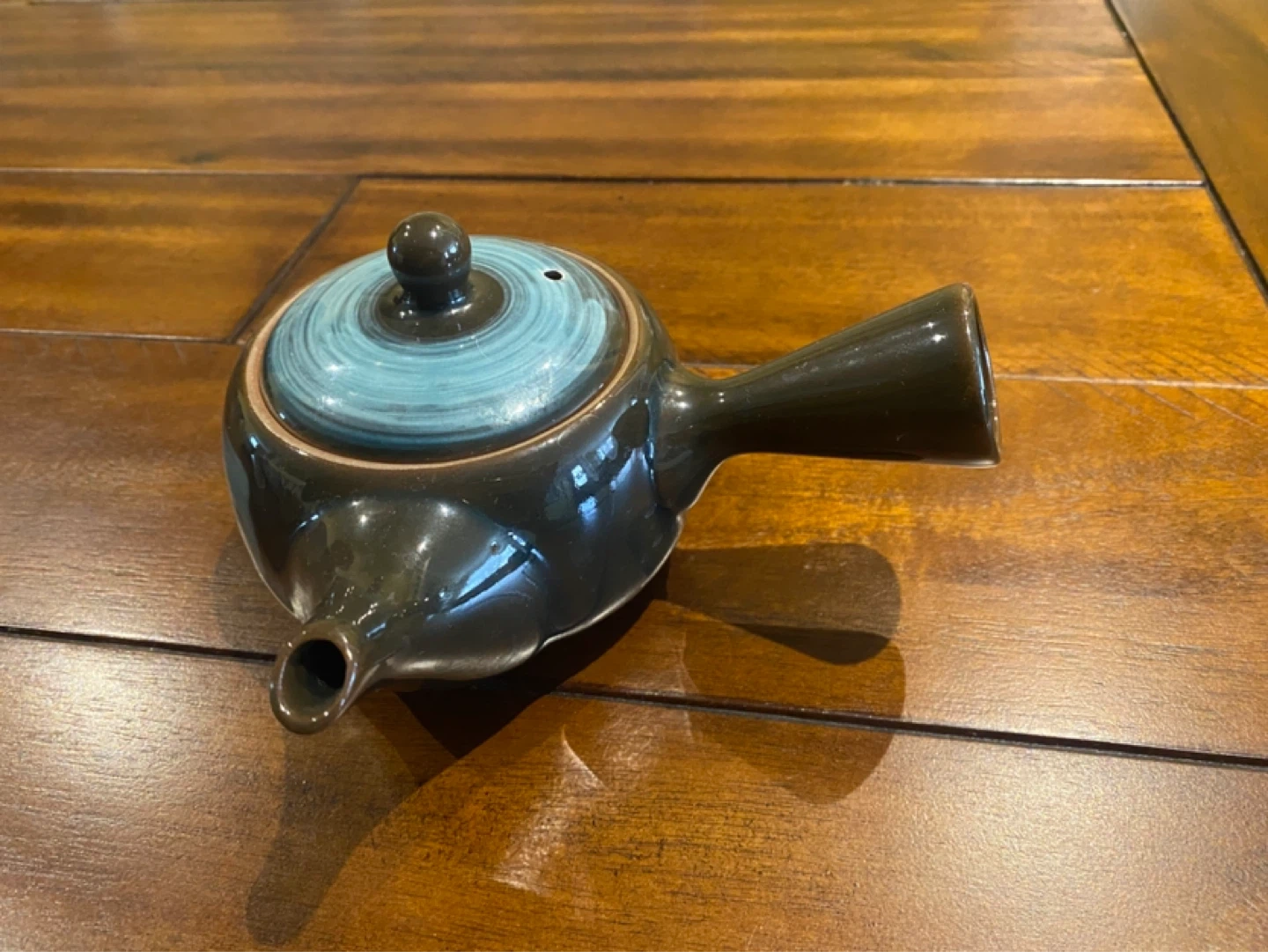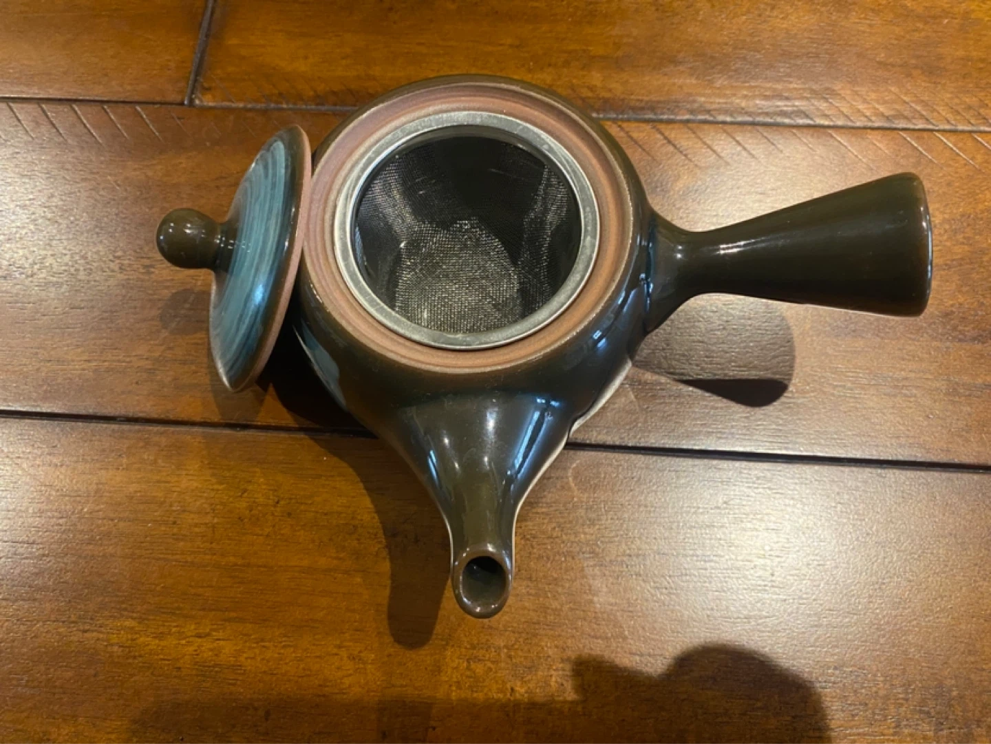 This ceramic teapot features a built-in mesh infuser for loose leaf tea. It has a dark brown exterior with a teal and brown patterned lid. The spout is designed for easy pouring.