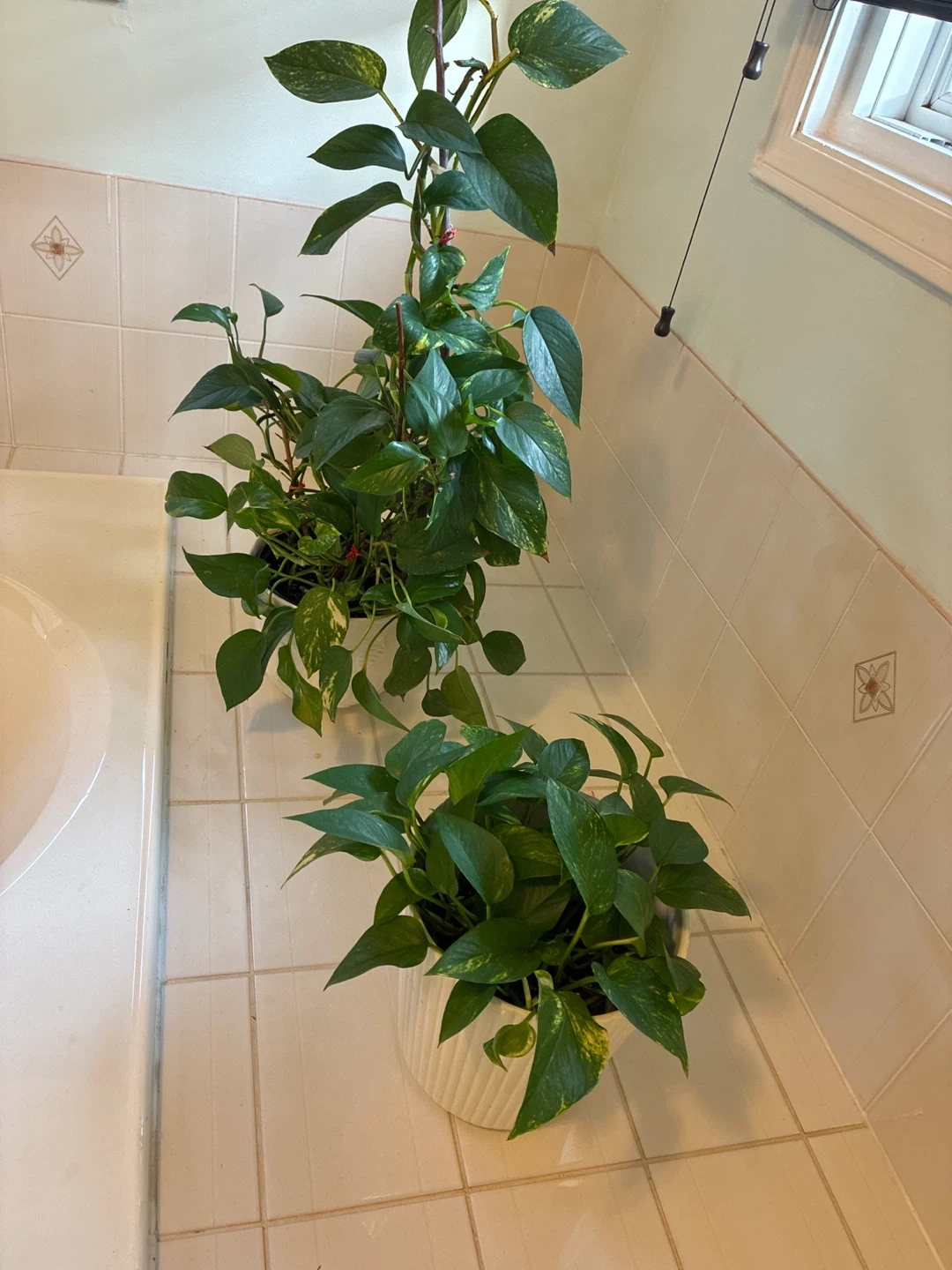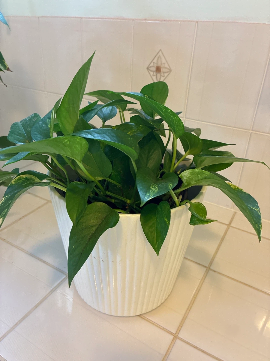 A lush Pothos plant featuring variegated green and yellow leaves. It's potted in a decorative white ribbed planter. This plant adds a touch of greenery to any indoor space. Its vines can trail or climb, making it versatile for decor!