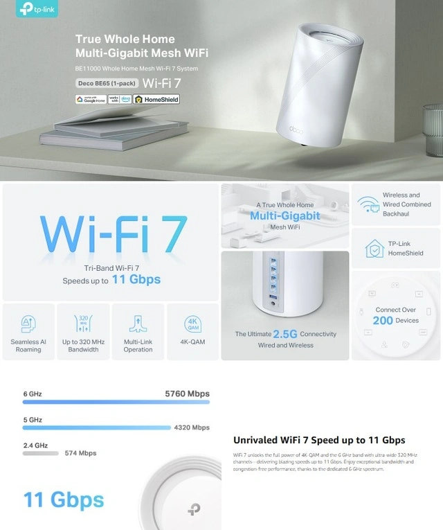Experience unprecedented speeds with 5760 Mbps on the 6 GHz Band, 4320 Mbps on the 5 GHz Band, and 574 Mbps on the 2.4 GHz Band. Features 4x 2.5 Gbps ports for wired devices like NAS, gaming PCs, and 4K TVs. Simultaneously send and receive data across different bands and channels to increase throughput, reduce latency, and improve reliability. Double the bandwidth of previous generations, enabling many more simultaneous transmissions at the fastest possible speeds. Minimizes congestion with greenfield spectrum, delivering robust high-speed connections for your most demanding devices. Provides comprehensive network protection, robust parental controls, and real-time IoT security to keep your family safe online.