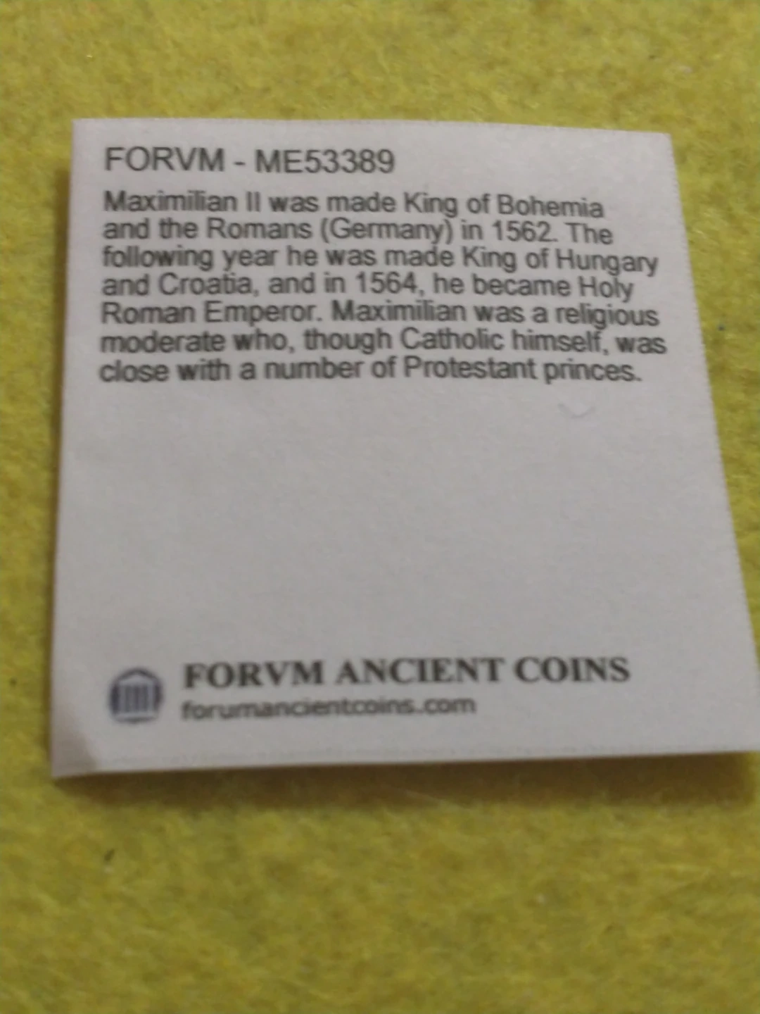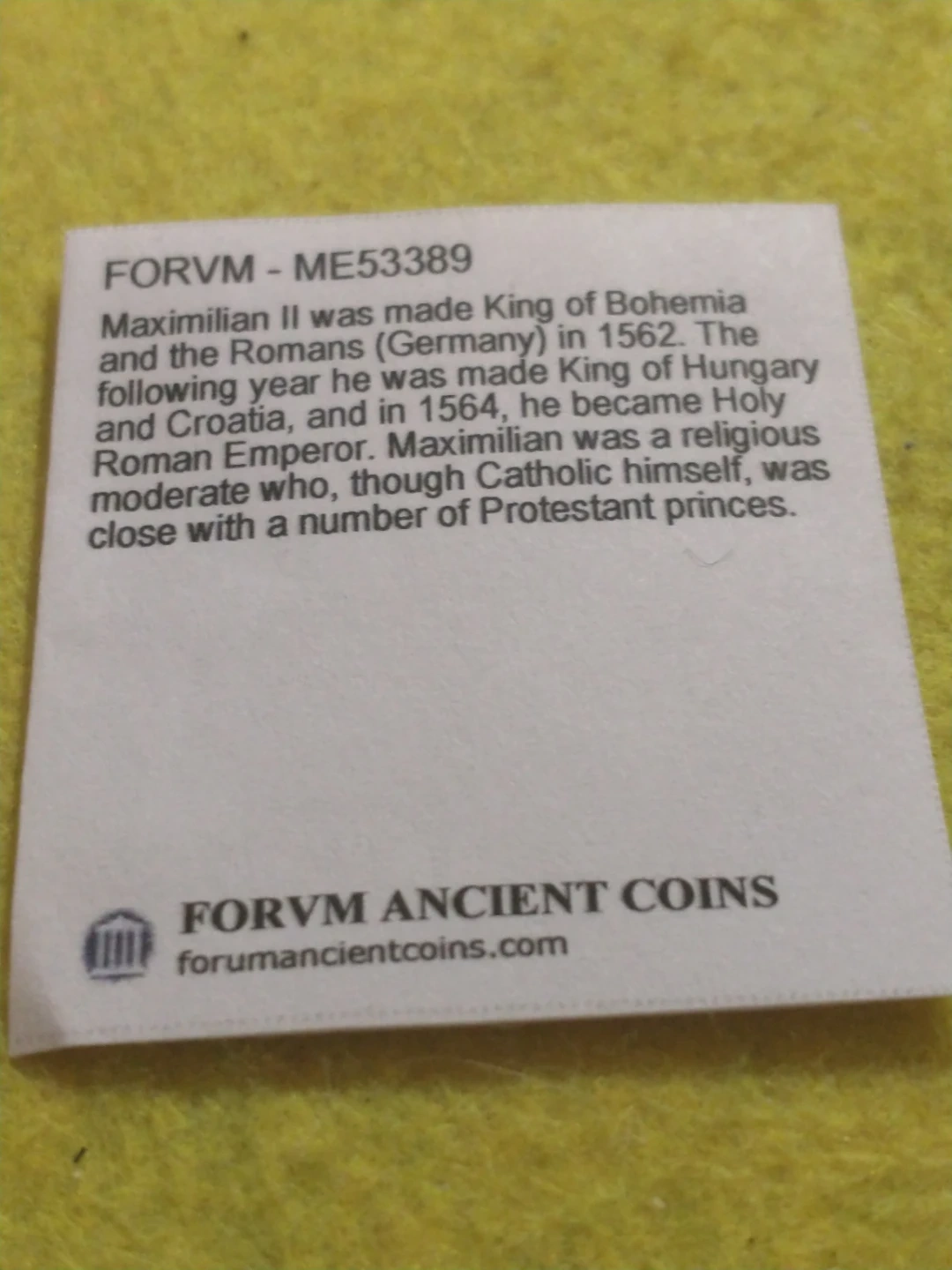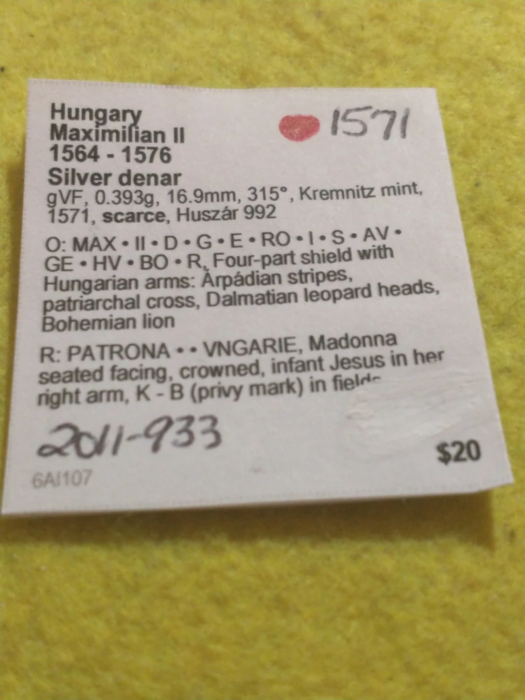 1571 AD Kingdom of Hungary Maximilian II silver denar #2011-933 in HB1. Purchased online from reputable dealer Forum Ancient Coins. Please refer to descriptive note, pictured.