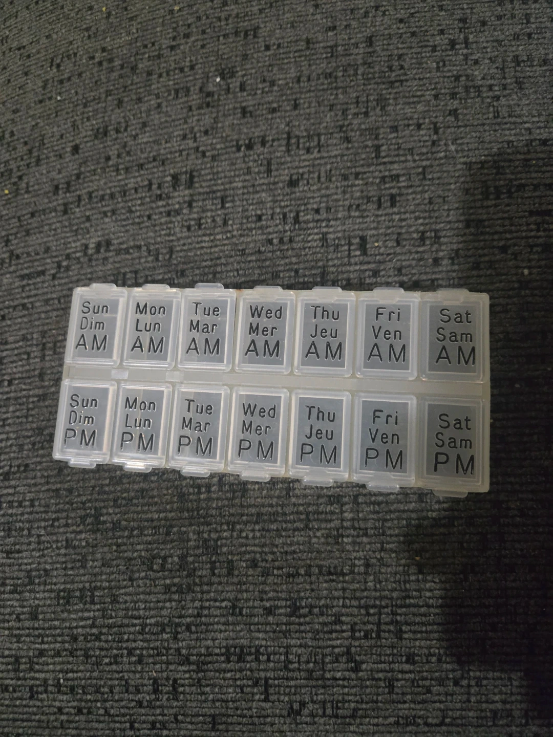 This pill organizer has compartments for each day of the week, separated into AM and PM. It's made of clear plastic and helps keep your medications sorted. Handy for travel or daily use!