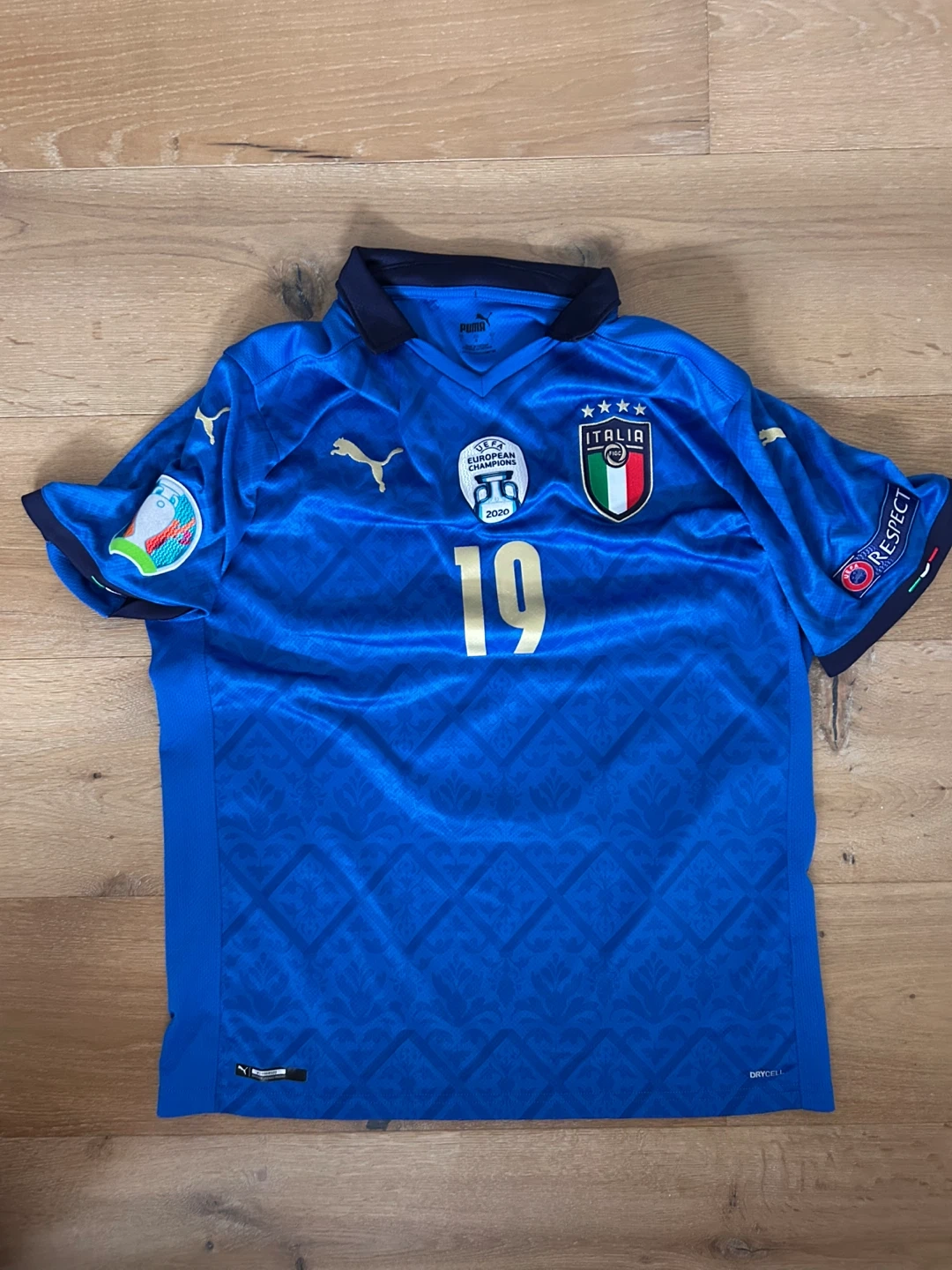 This is a Puma Italy National Football Team jersey, featuring Bonucci and the number 19. It's a men's size L, made with DryCELL technology for moisture-wicking. This jersey commemorates UEFA European Championship 2020.