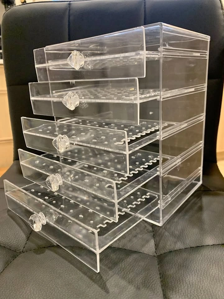 In good condition, this clear 5-tier case box is perfect for earrings, necklaces, or bracelets.