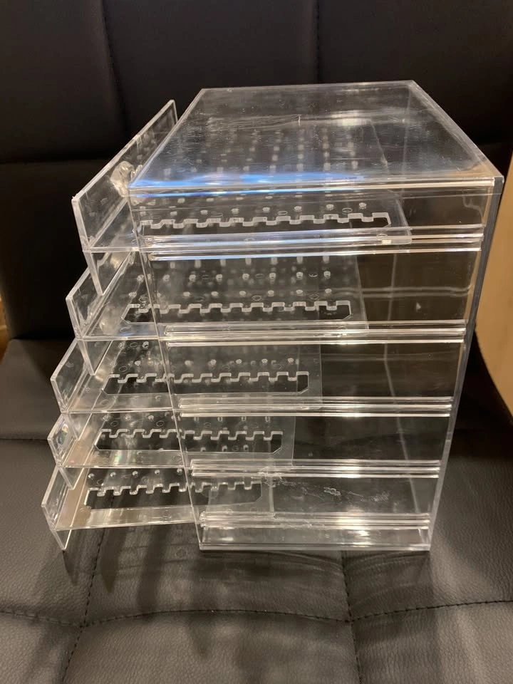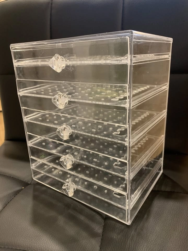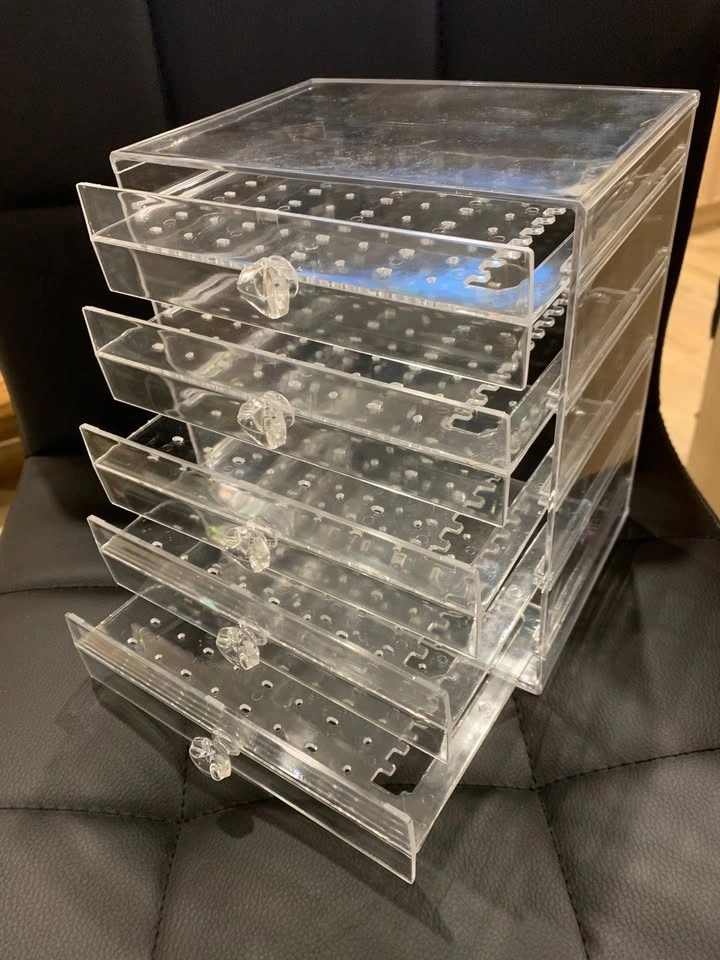 In good condition, this clear 5-tier case box is perfect for earrings, necklaces, or bracelets.