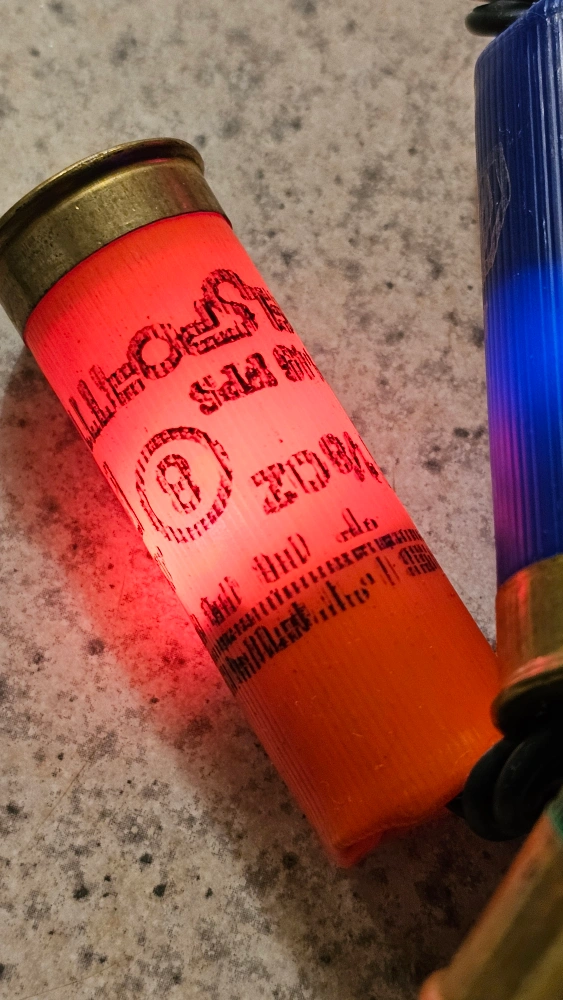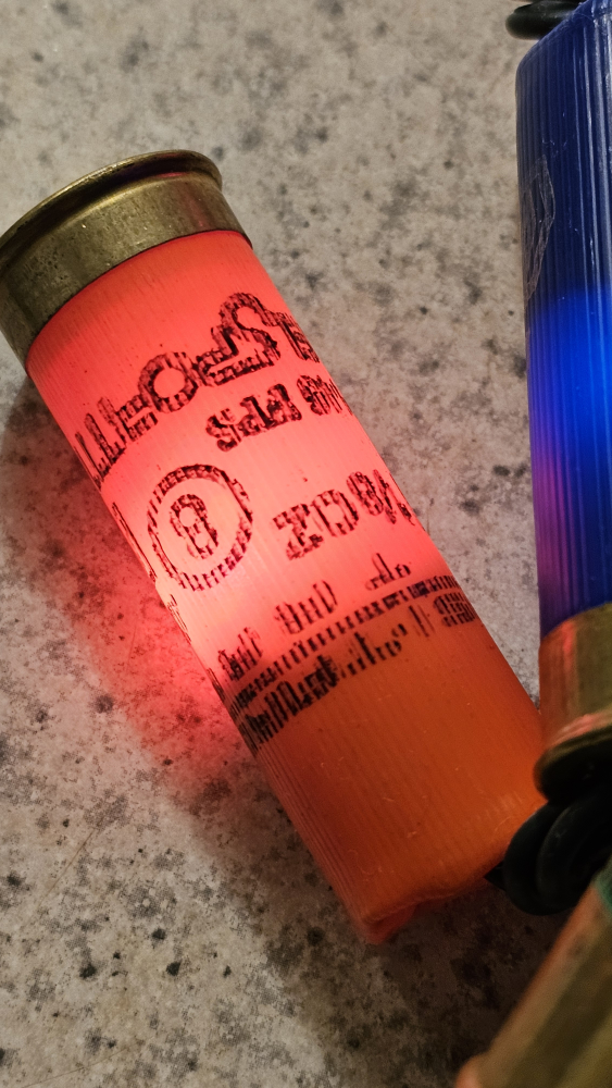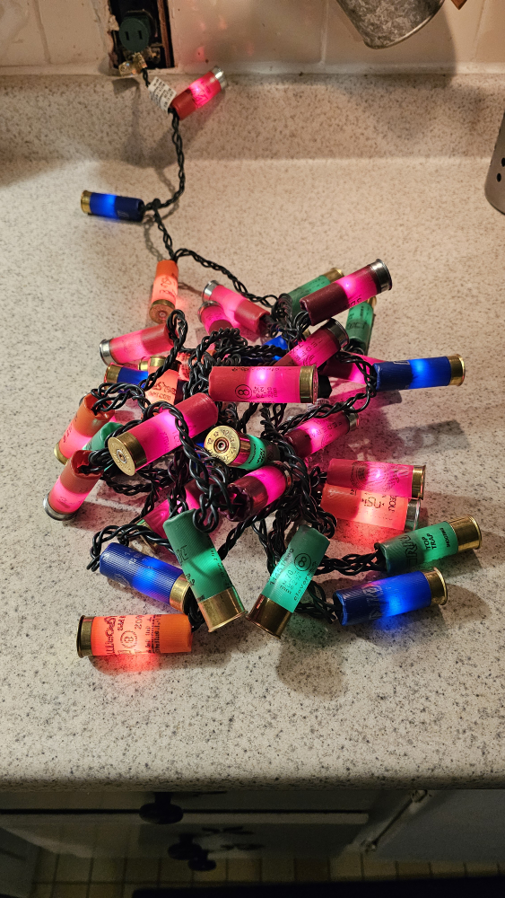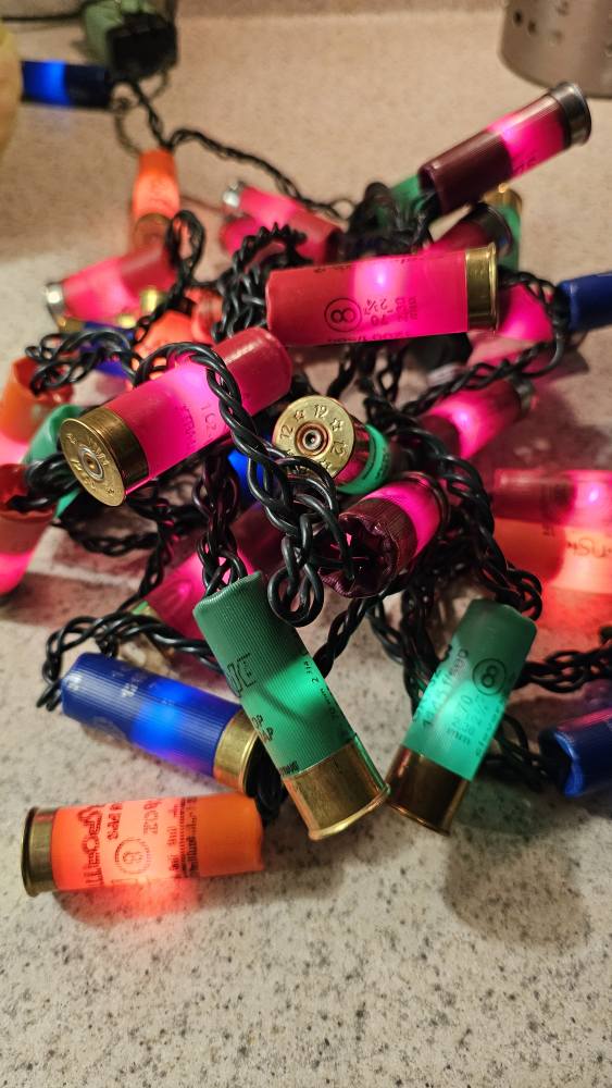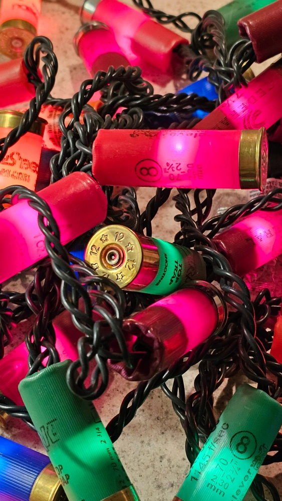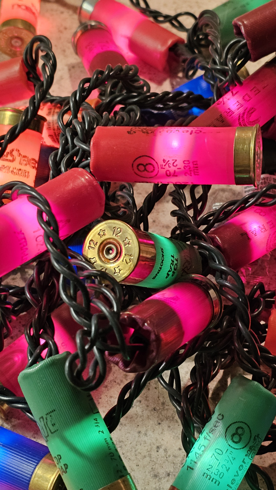 String of Christmas lights shaped like shotgun shells. Multiple colours.