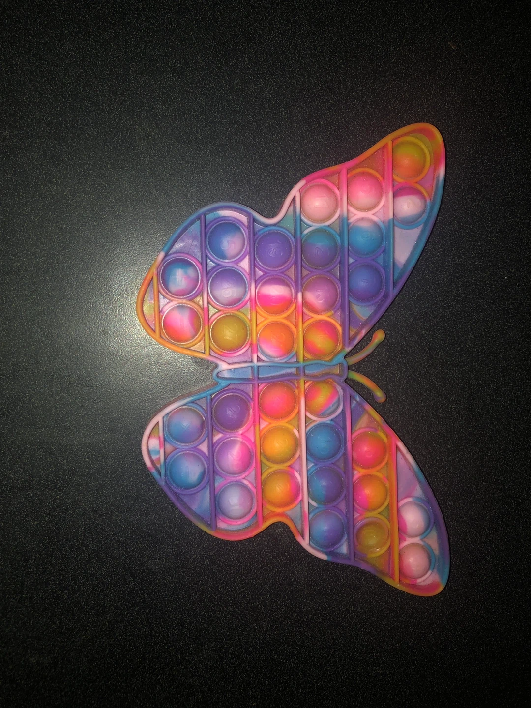 This butterfly-shaped pop it fidget toy has a colourful tie-dye design. It's made of silicone and provides satisfying popping sounds and tactile feedback. This toy's great for stress relief and fun for all ages!