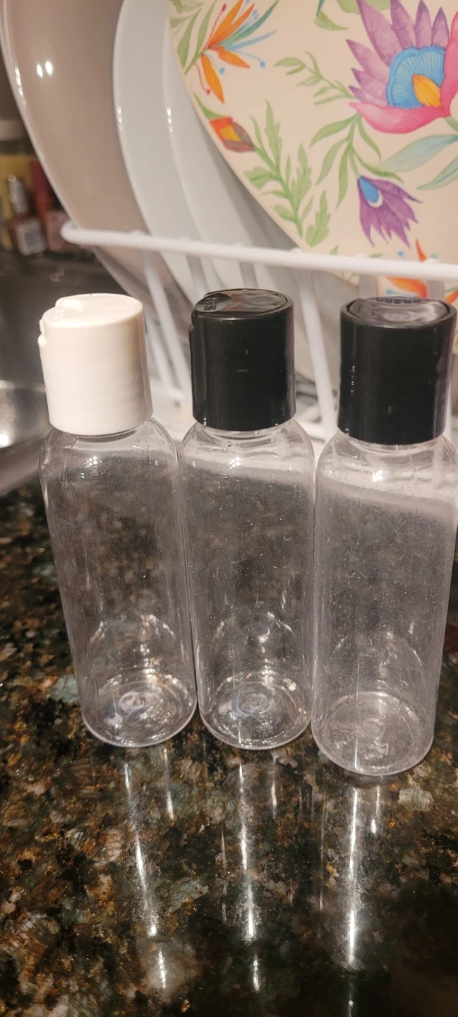 Three clear plastic travel bottles with flip-top caps. Ideal for carrying liquids like shampoo, conditioner, or lotions on the go. Convenient for travel or gym bags!
