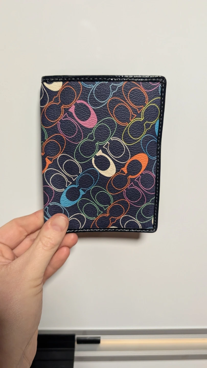 This is a Coach document holder featuring the iconic C logo print in a colourful pattern. It's lined in bright turquoise and has multiple card slots inside. It's perfect for keeping your travel documents or important cards organized.