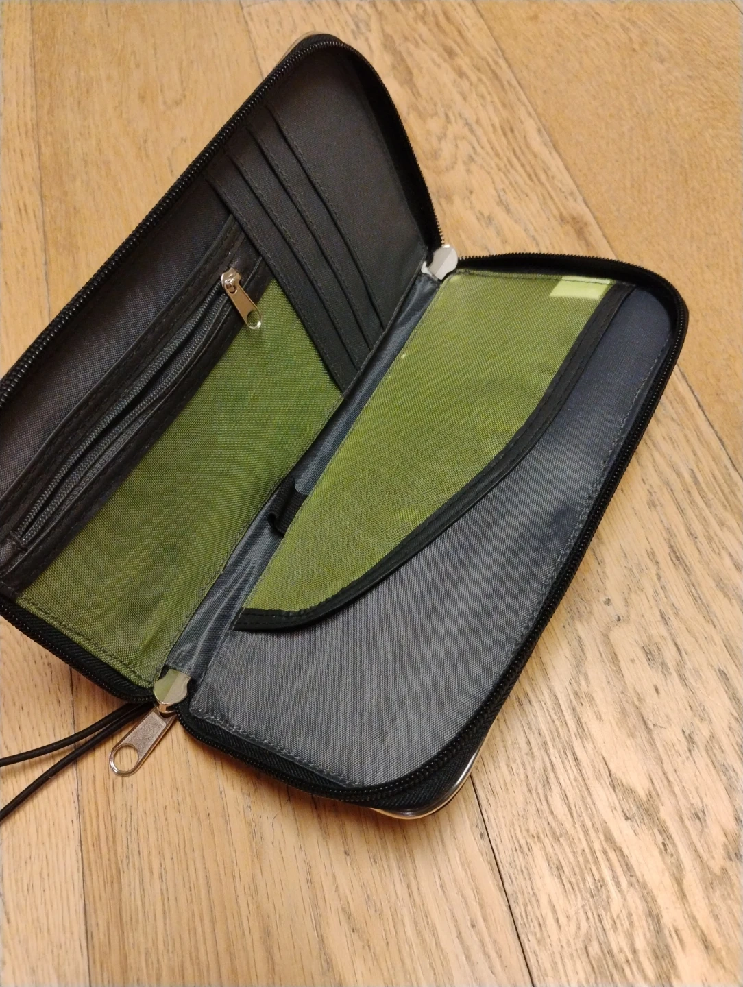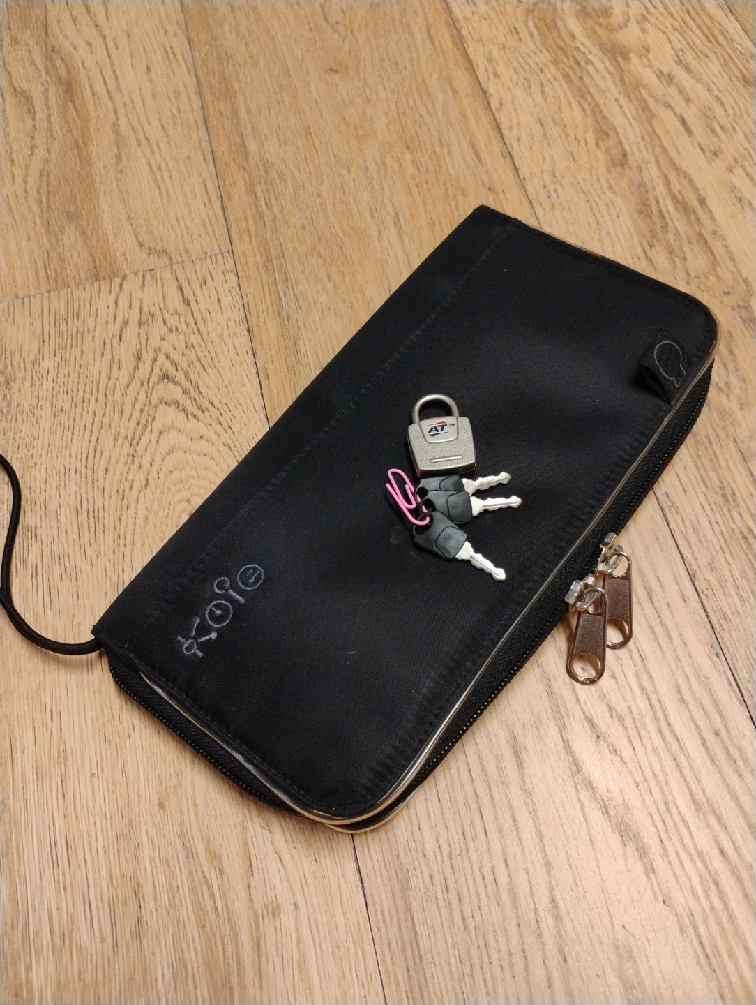 Travel wallet with zippered closure and a wrist strap. Several compartments for organizing your travel documents, cards, money and coins. Comes with the lock for extra security.
