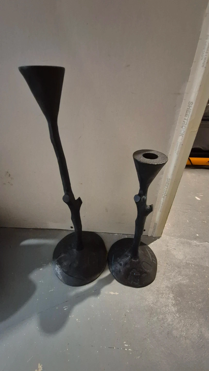 Here's a neat set of two black metal candlestick holders with a branch-like design. These would add a rustic touch to any space. They're made of metal and have a sturdy base.