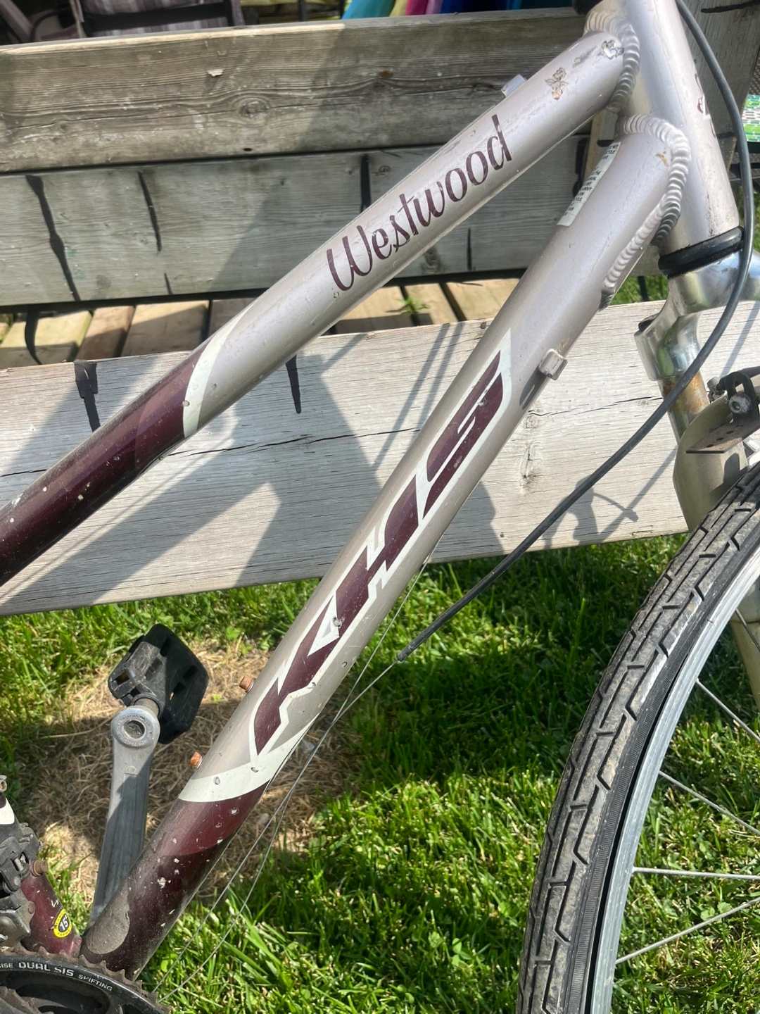 Bike frame in silver and burgundy. Has a black seat, and tires. Gear shifting controls on the handlebars. Makes a great ride through the park.