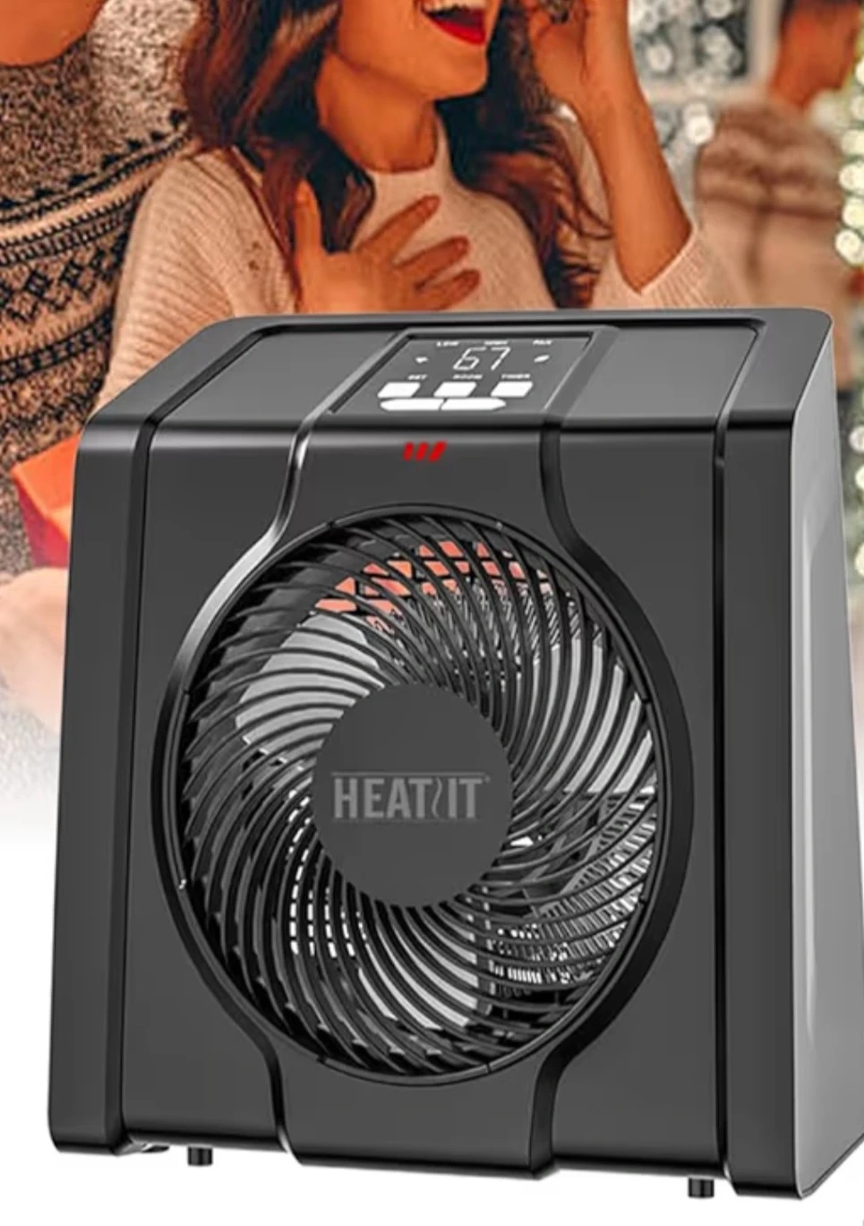 This portable electric fan heater provides quick warmth. It features a digital display showing the current temperature. Compact design for easy placement.