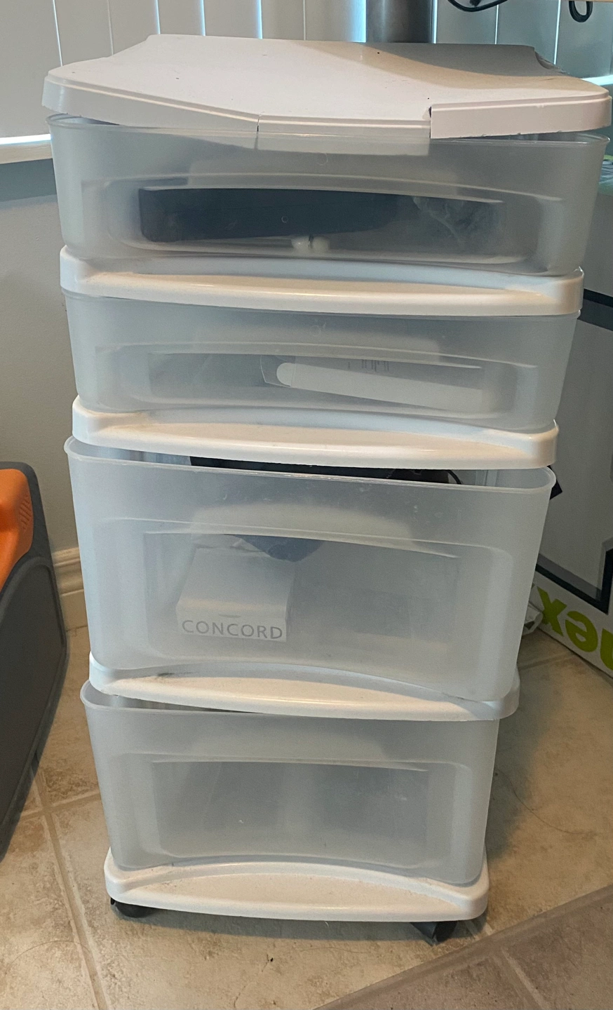 The top plastic is cracked but everything else is good. All the drawers still work so it's more cosmetic