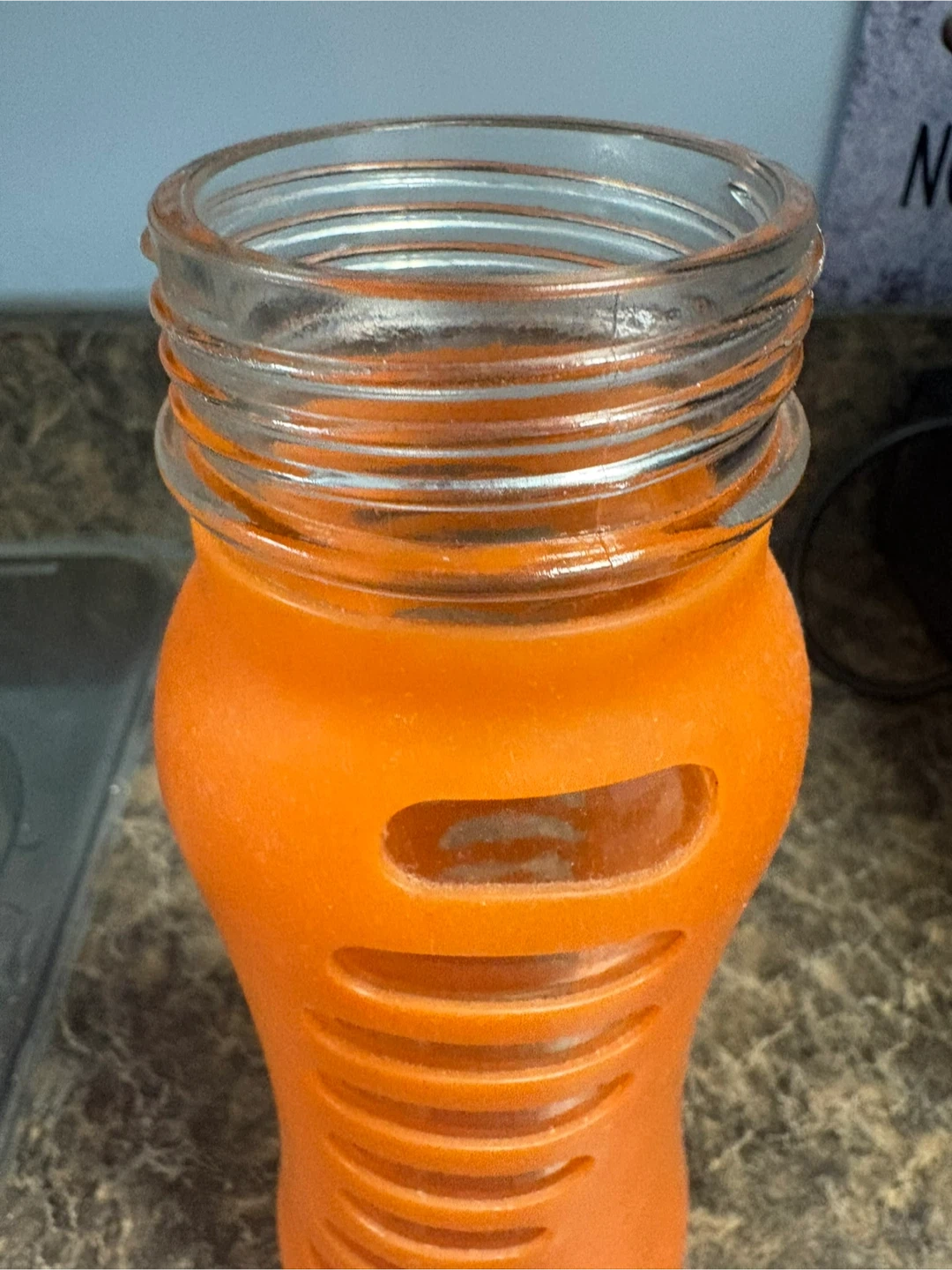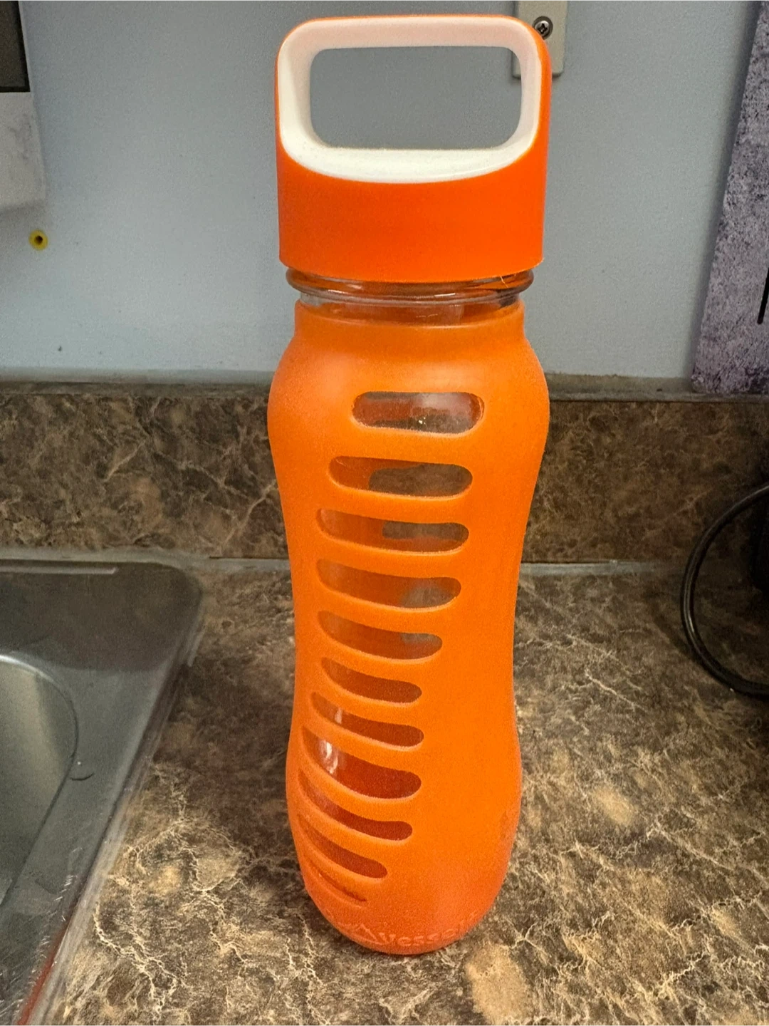 This is an orange water bottle with a glass interior and a silicone protective sleeve. It features a white carrying handle on top. This bottle is great for staying hydrated on the go!