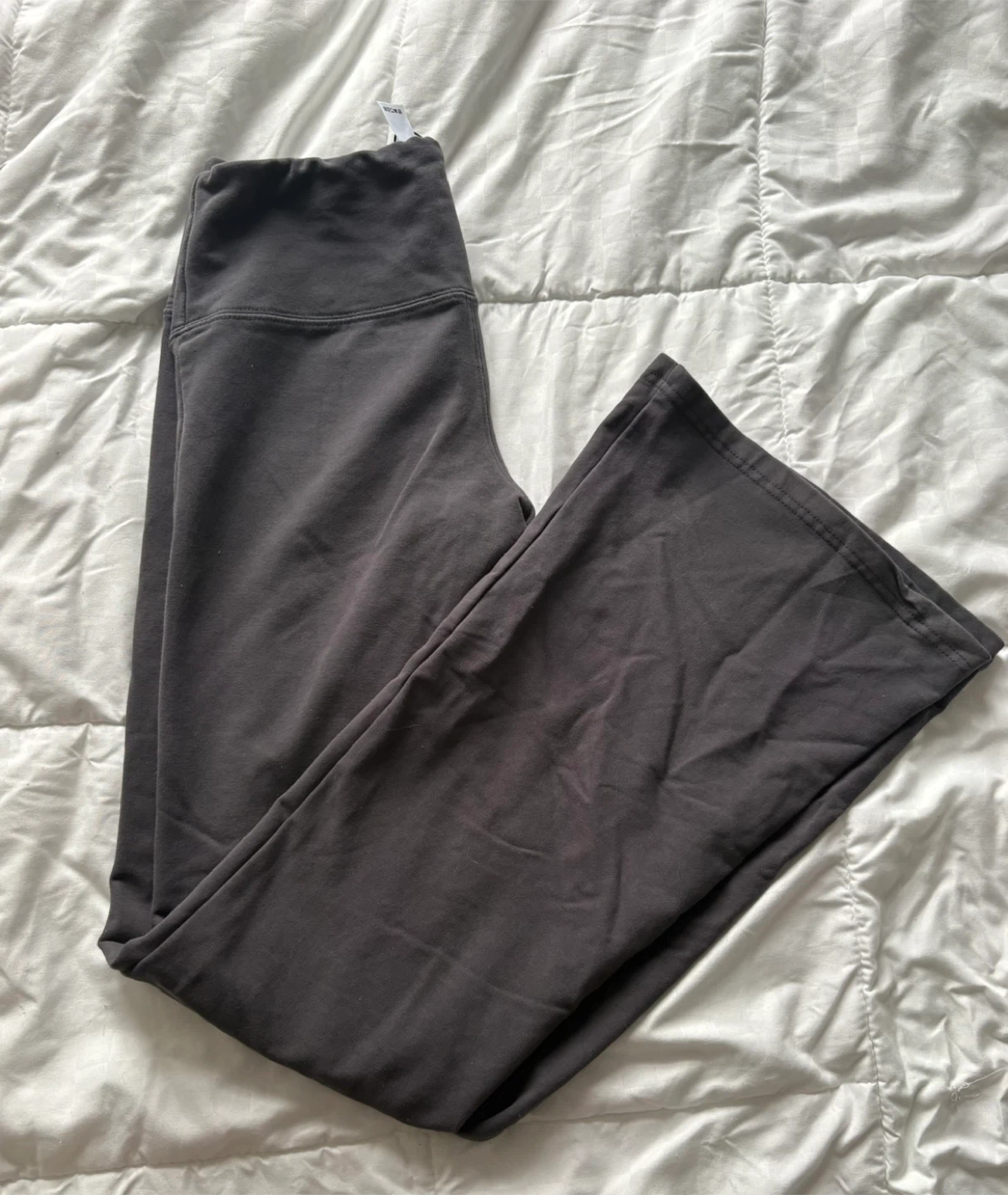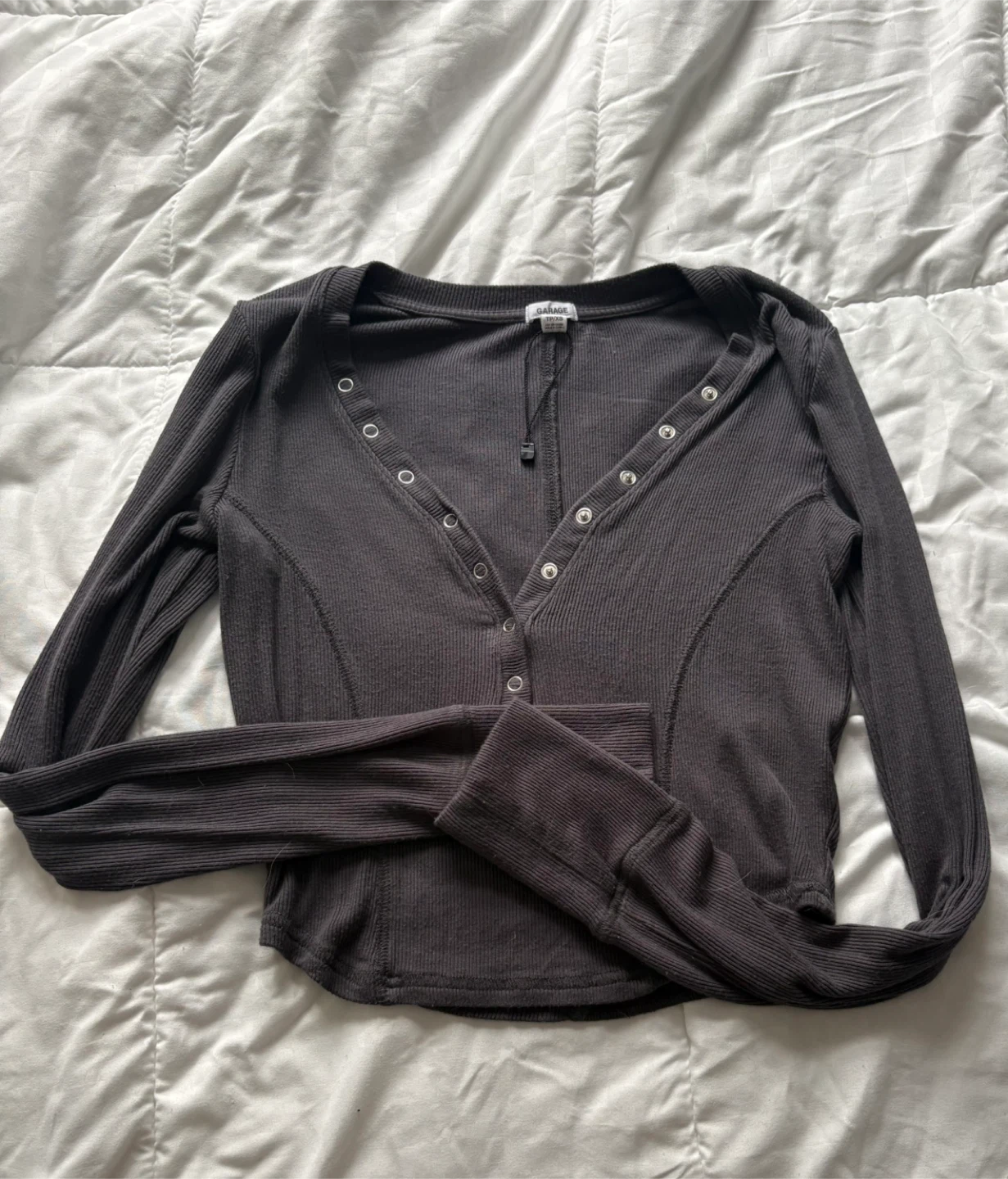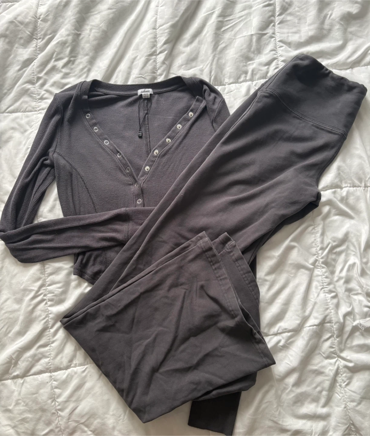 A ribbed charcoal grey henley top with a snap button closure and matching flare pants from Garage. This comfy set is great for casual wear or lounging. It's made from a soft, stretchy material.