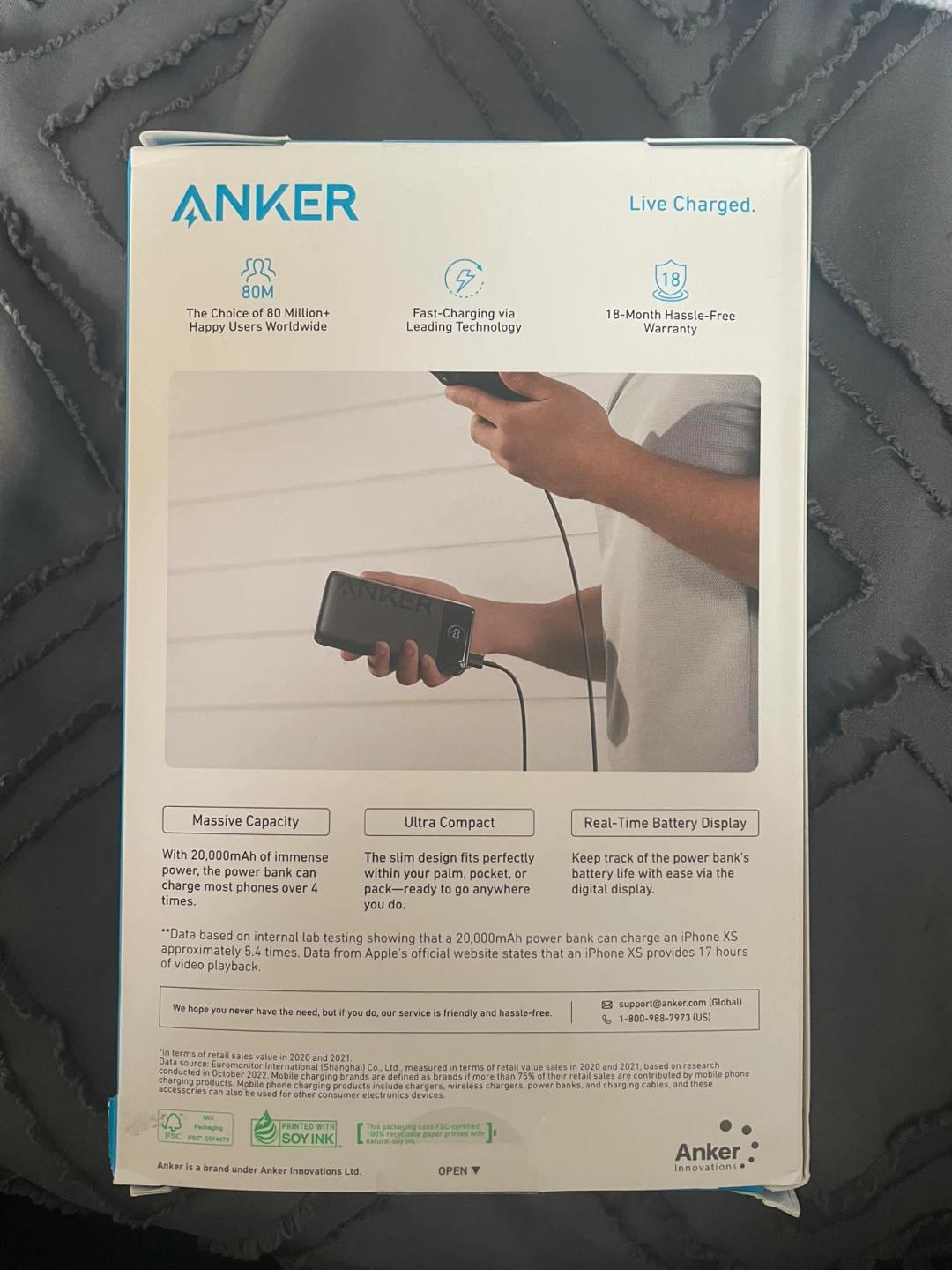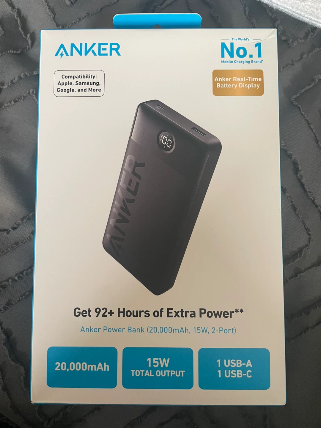 Anker power bank with 20,000mAh capacity and real-time battery display. It features 15W total output with one USB-A and one USB-C port. Get 92+ hours of extra power!
