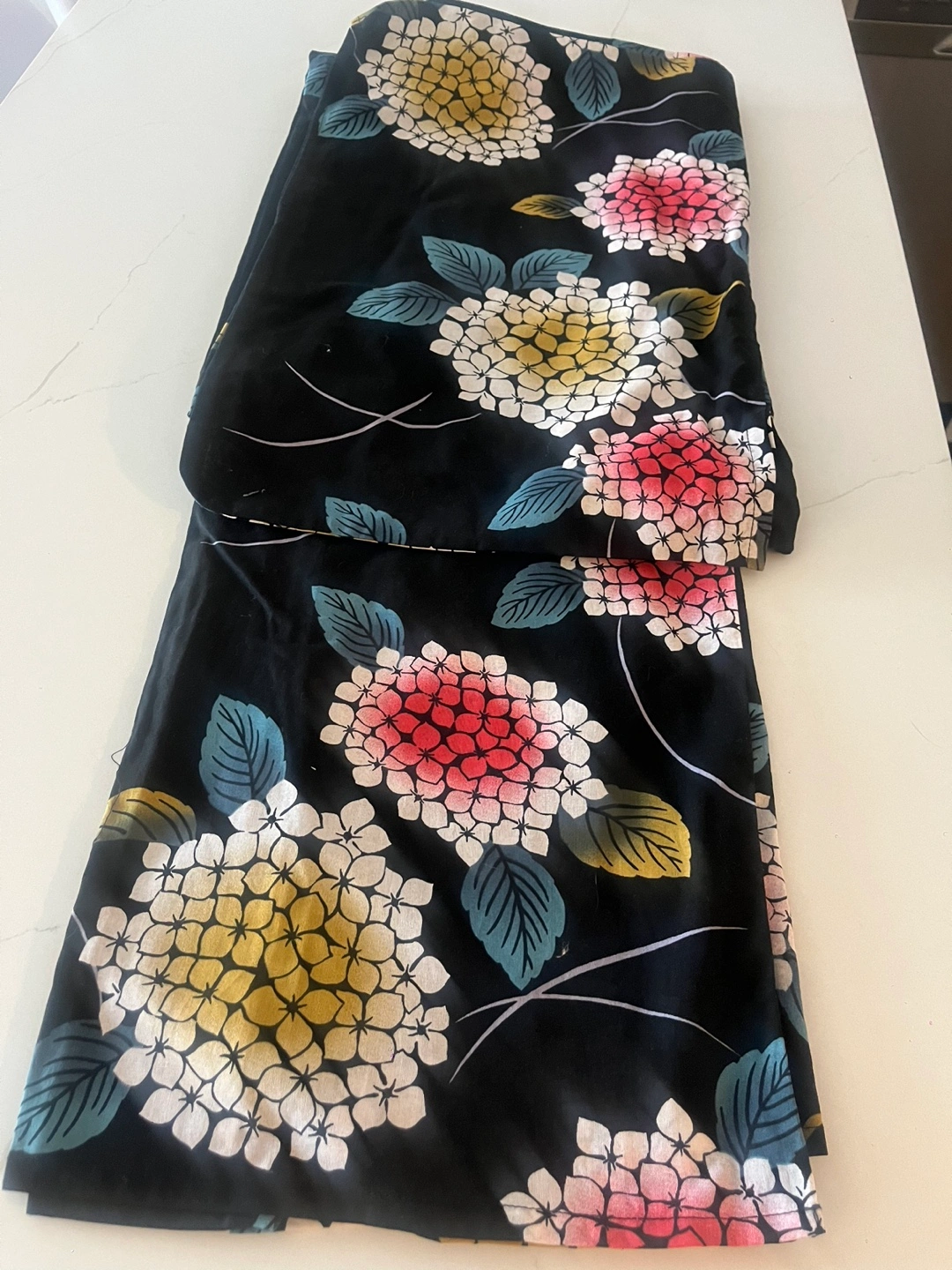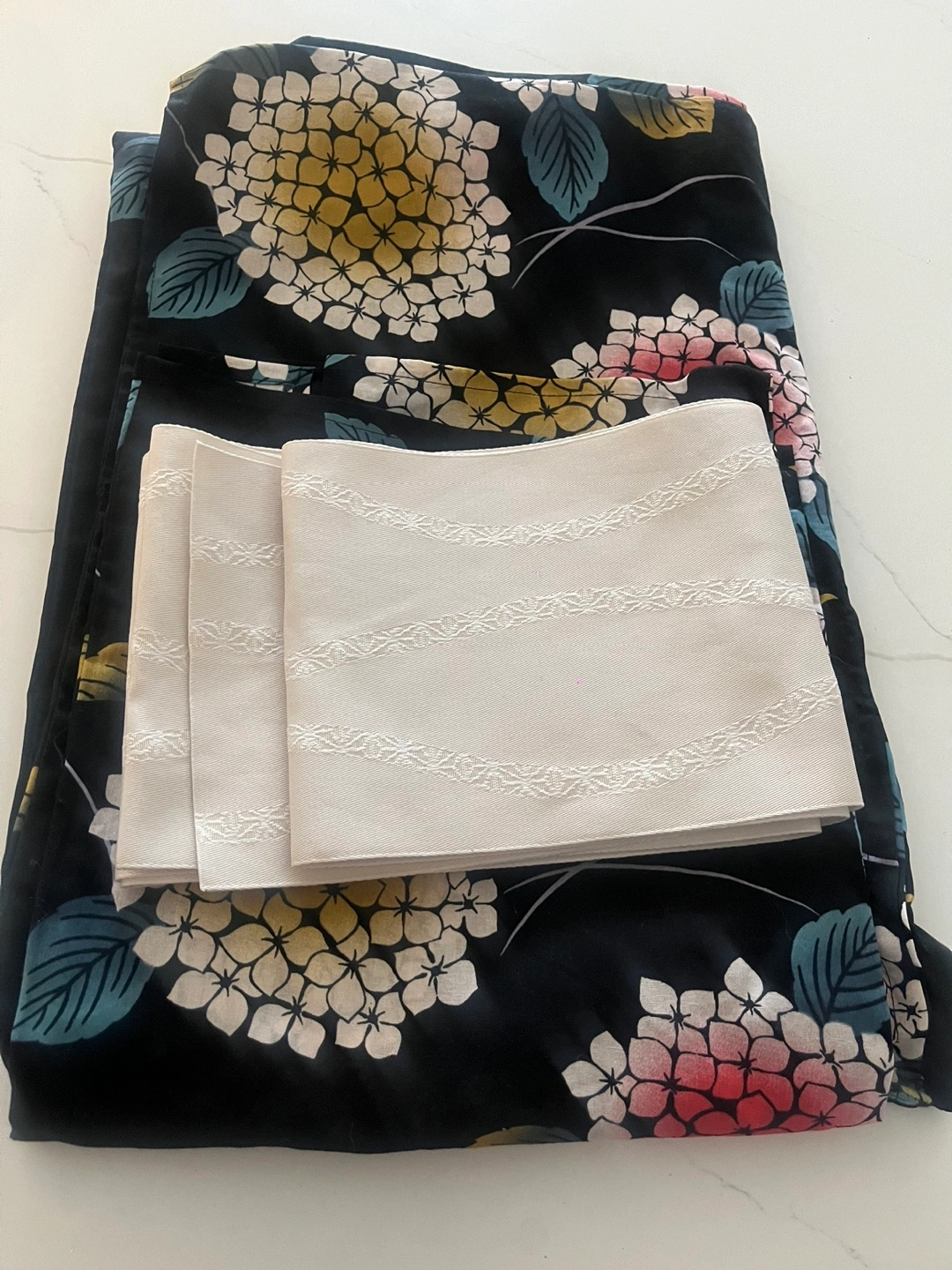 Navy yukata with a floral pattern. Includes matching obi. Great condition with no rips or stains. New and pretty!