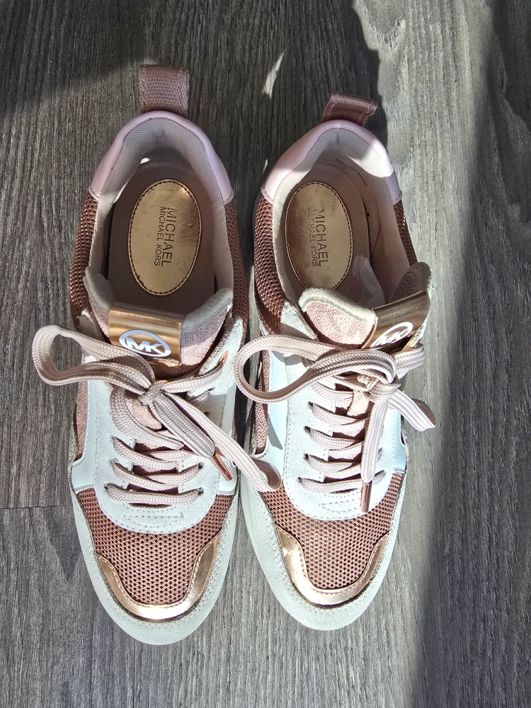 They're in great condition and feature a stylish golden pink design with the MK logo. Perfect for casual wear or workouts!