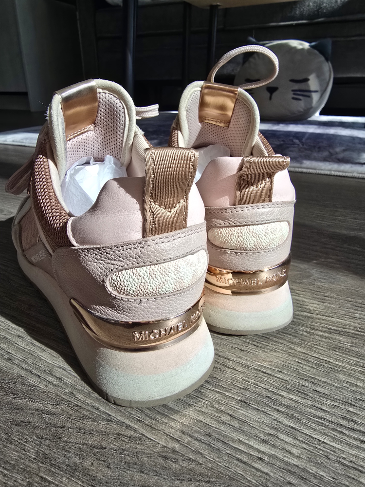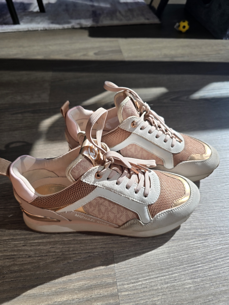 They're in great condition and feature a stylish golden pink design with the MK logo. Perfect for casual wear or workouts!