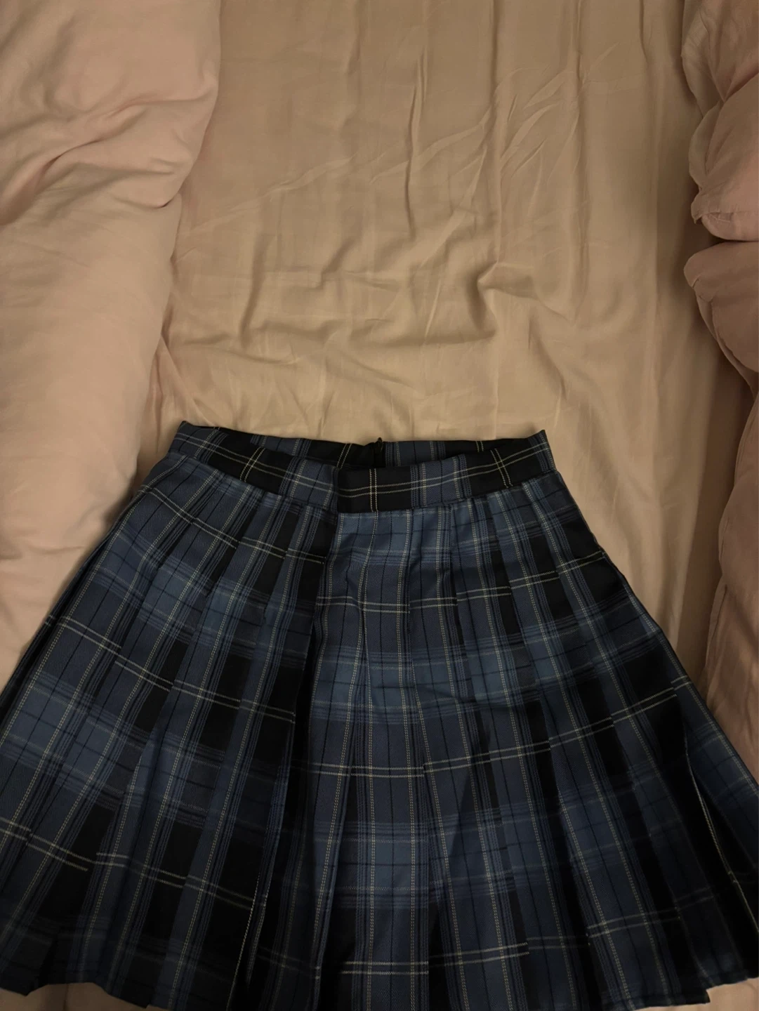A blue and black plaid pleated mini skirt. It has a zipper closure at the back. This skirt is perfect for creating a classic academic look.