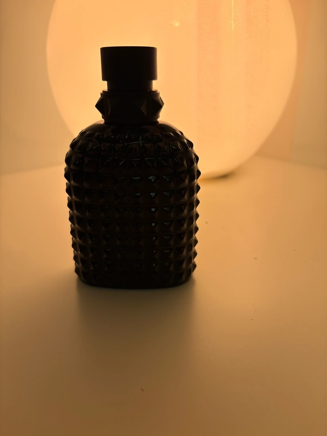 This is the Valentino Uomo Born in Roma Eau de Parfum. It comes in a black studded bottle.