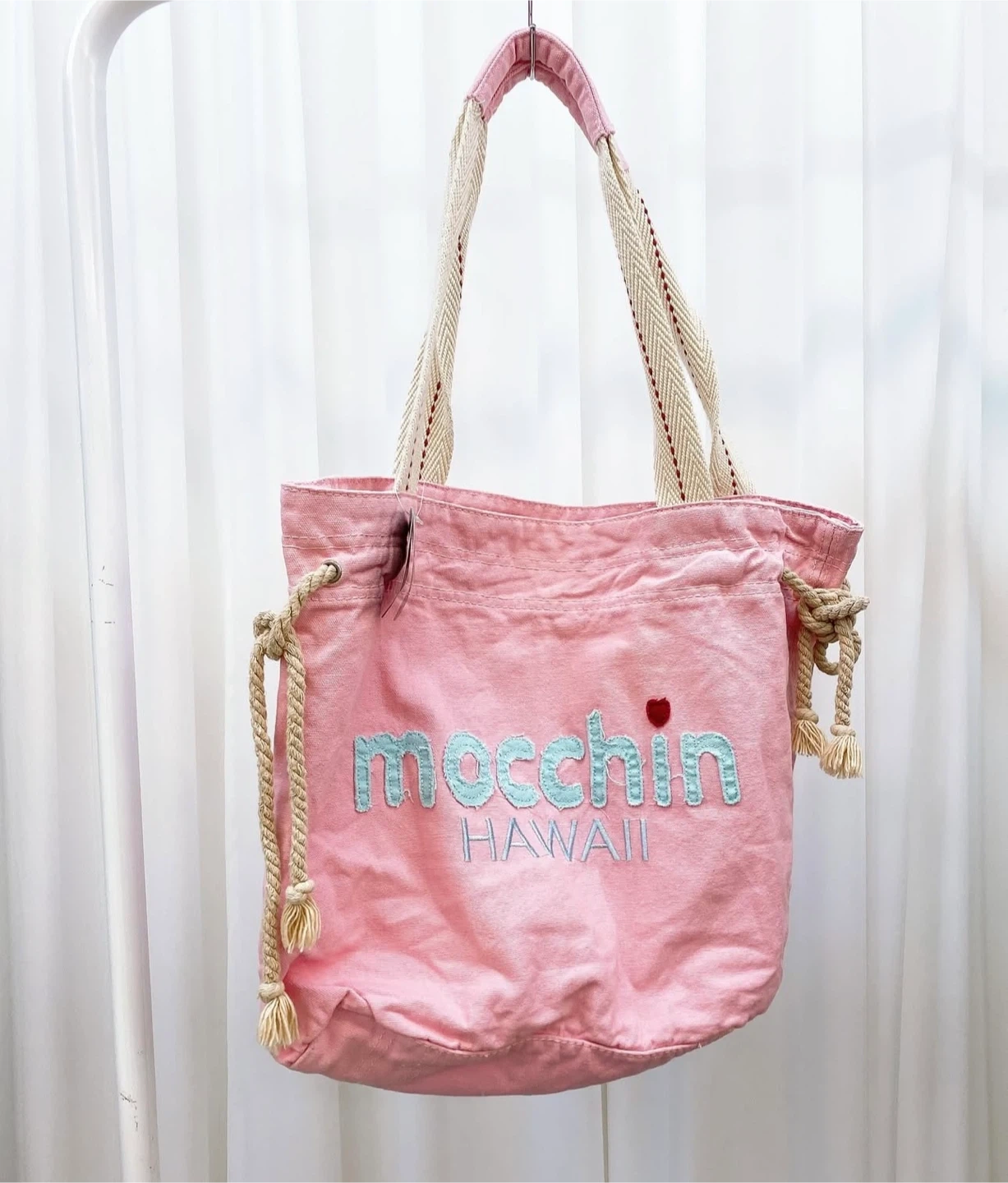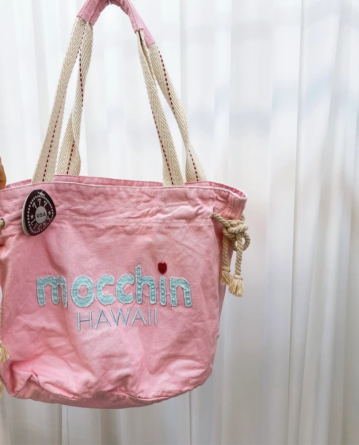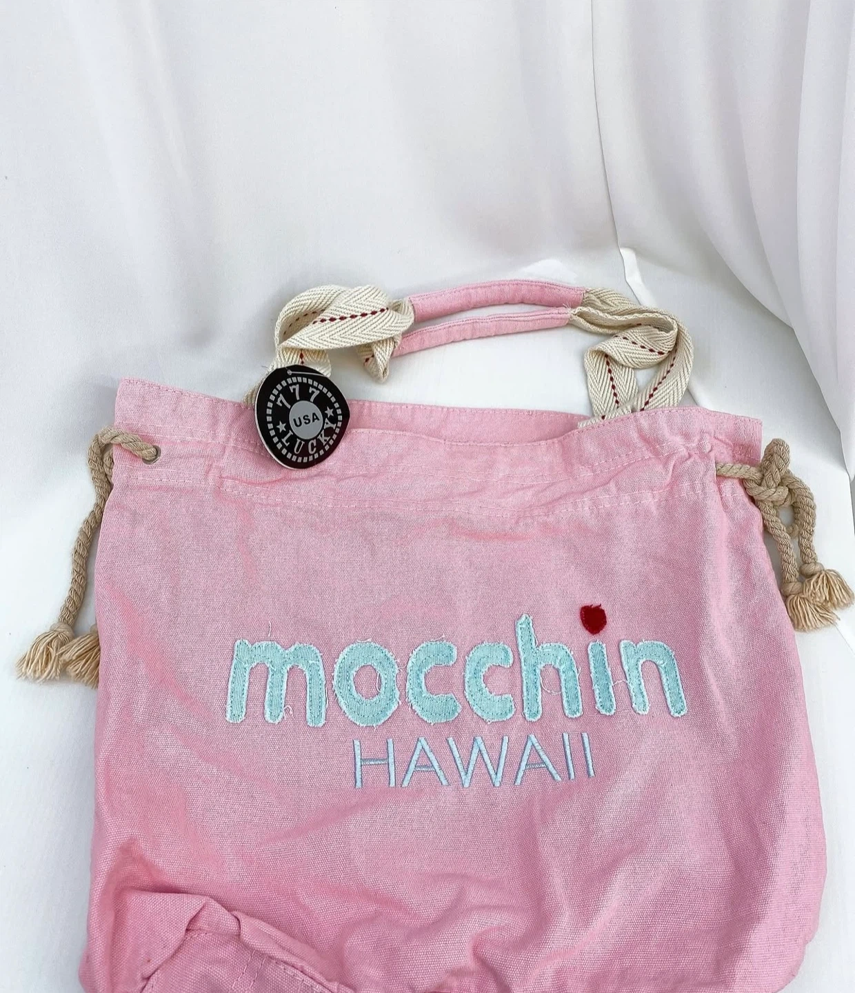 A stylish and functional Mocchin Hawaii embroidered tote bag made from durable canvas, designed with rope drawstring details and sturdy woven shoulder straps. This versatile eco-friendly bag is perfect for daily use, beach trips, travel, or shopping. Its lightweight yet spacious design makes it an ideal companion for casual wear, vacation outfits, or carrying essentials on the go.