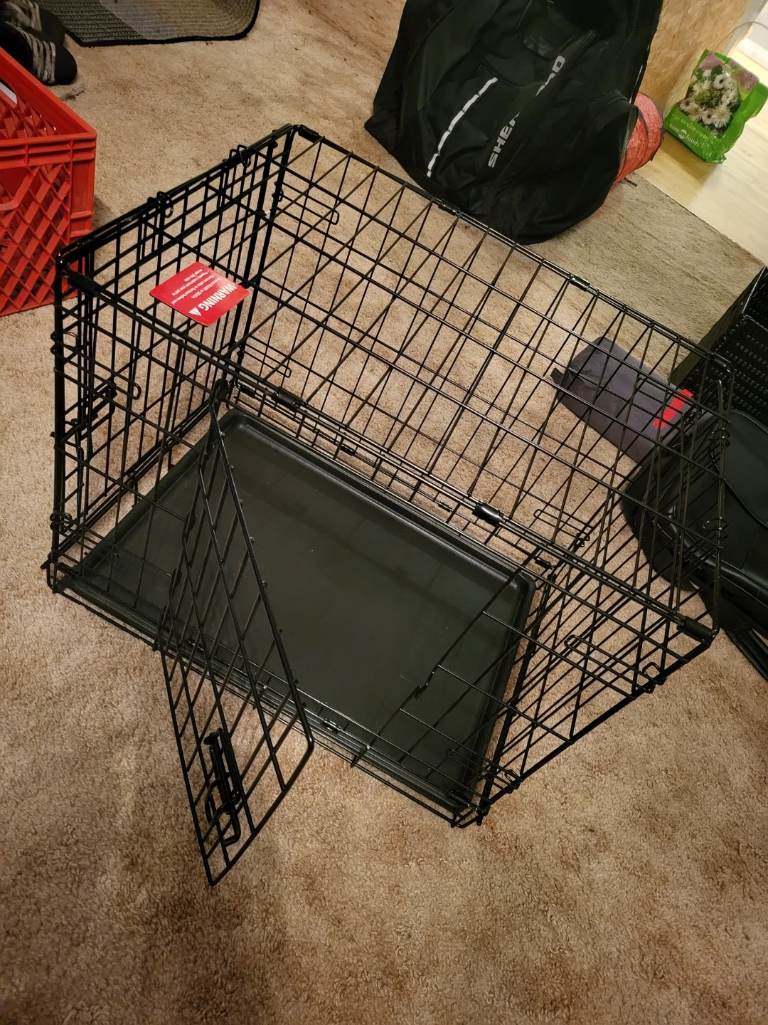 This is a black wire dog crate. It includes a removable black plastic tray. The wire construction allows for good ventilation.