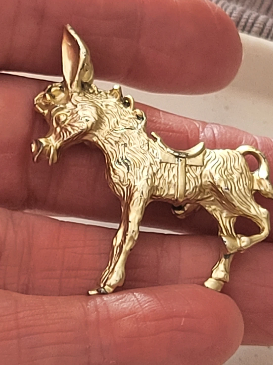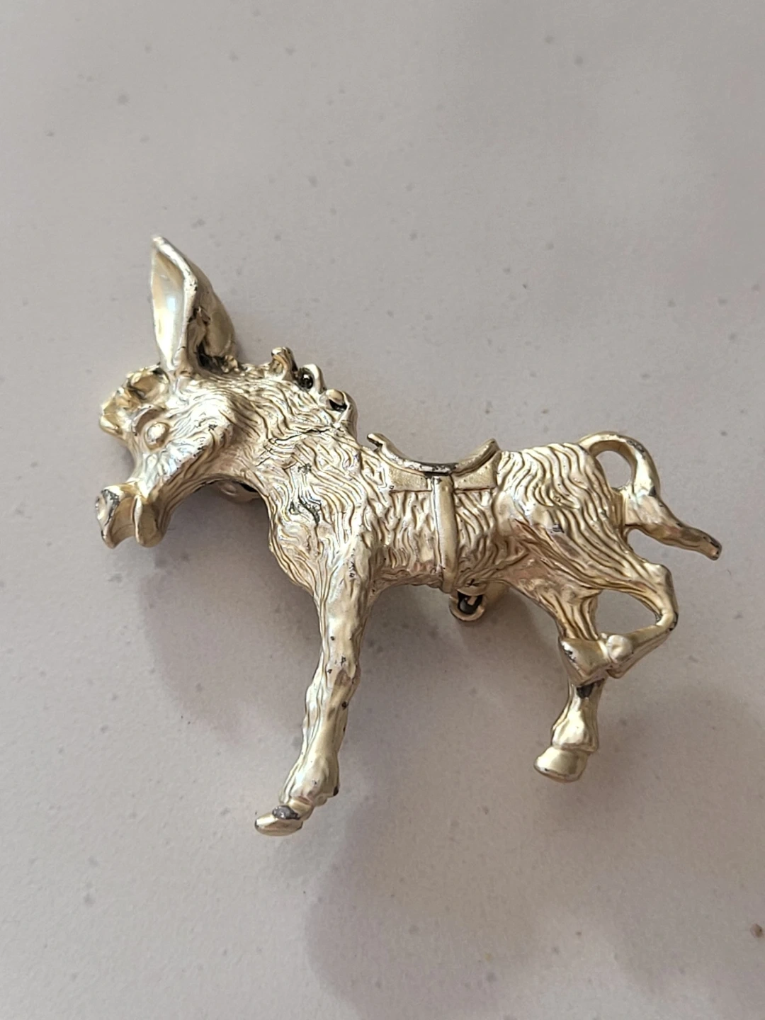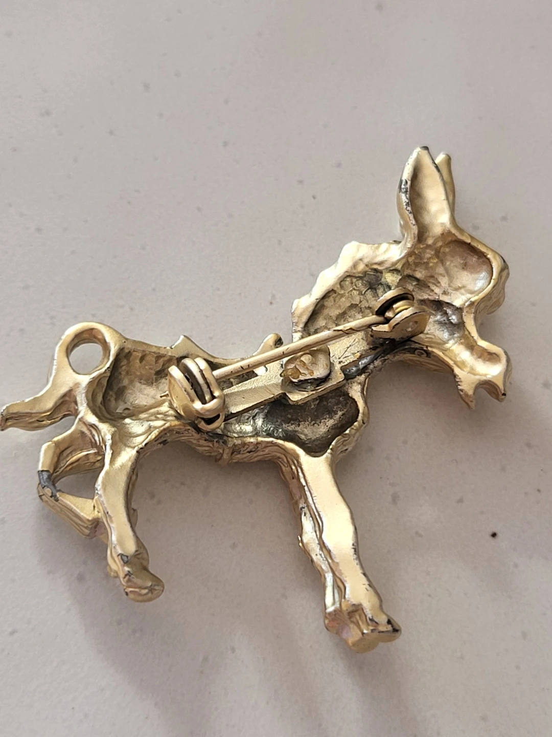 A detailed gold-toned donkey-shaped brooch. It has a classic pin backing for secure attachment. This unique accessory adds a playful touch to any outfit!