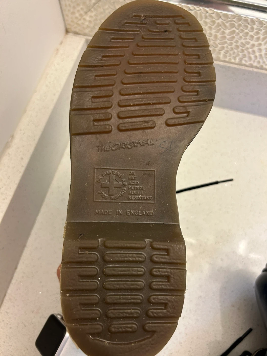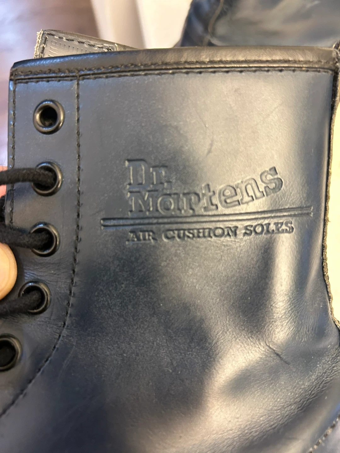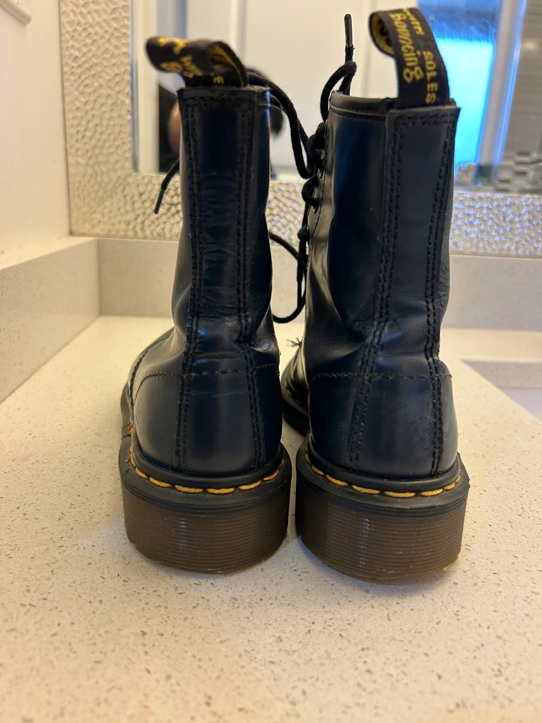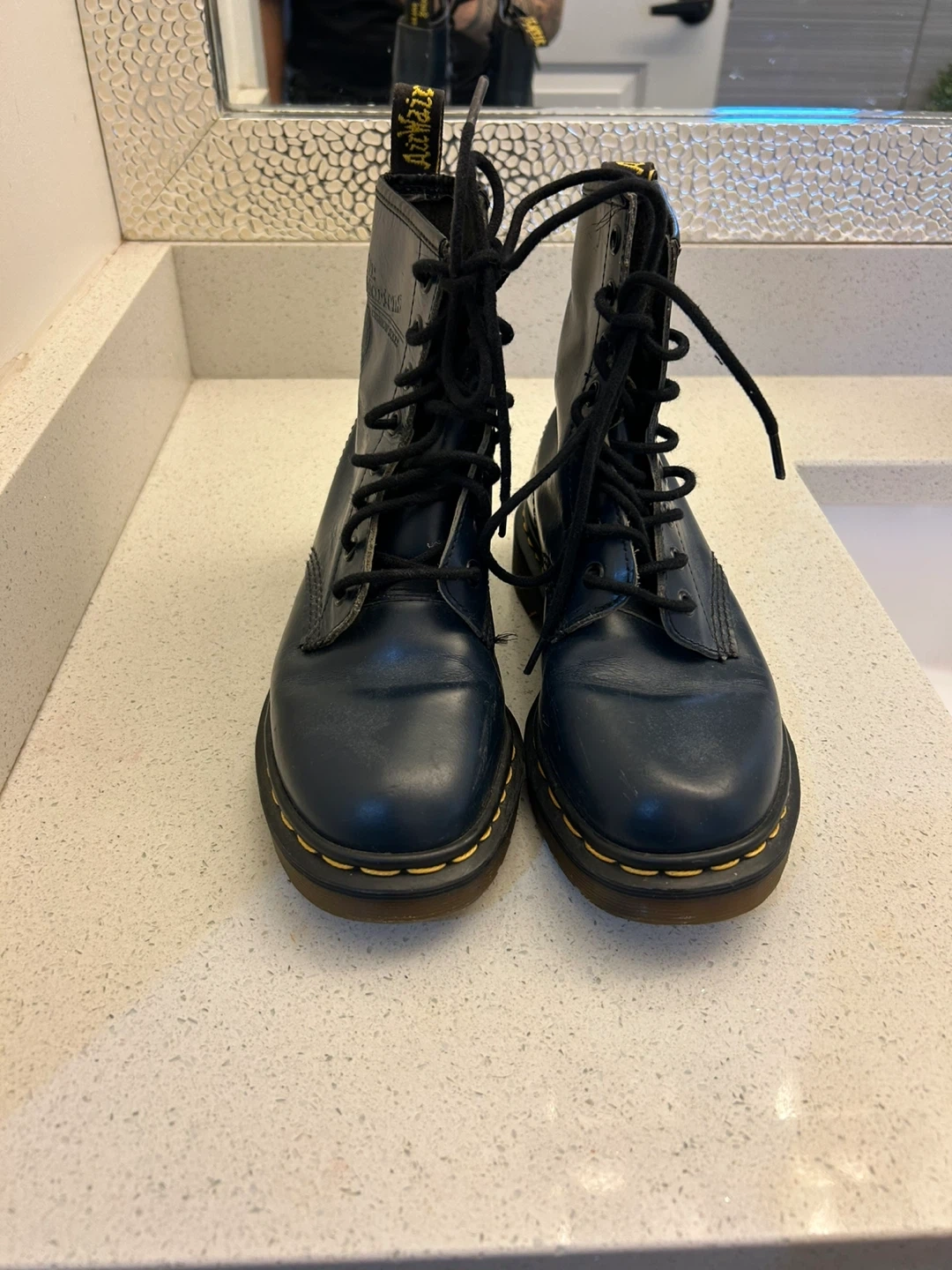 Classic Dr. Martens 1460 boots in a navy blue colour. They're made with leather and feature air cushion soles for comfort. These boots were made in England and are oil, acid, and petrol resistant.