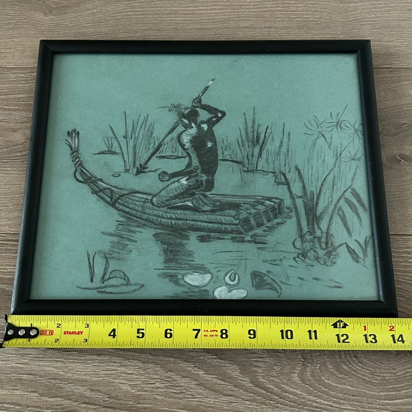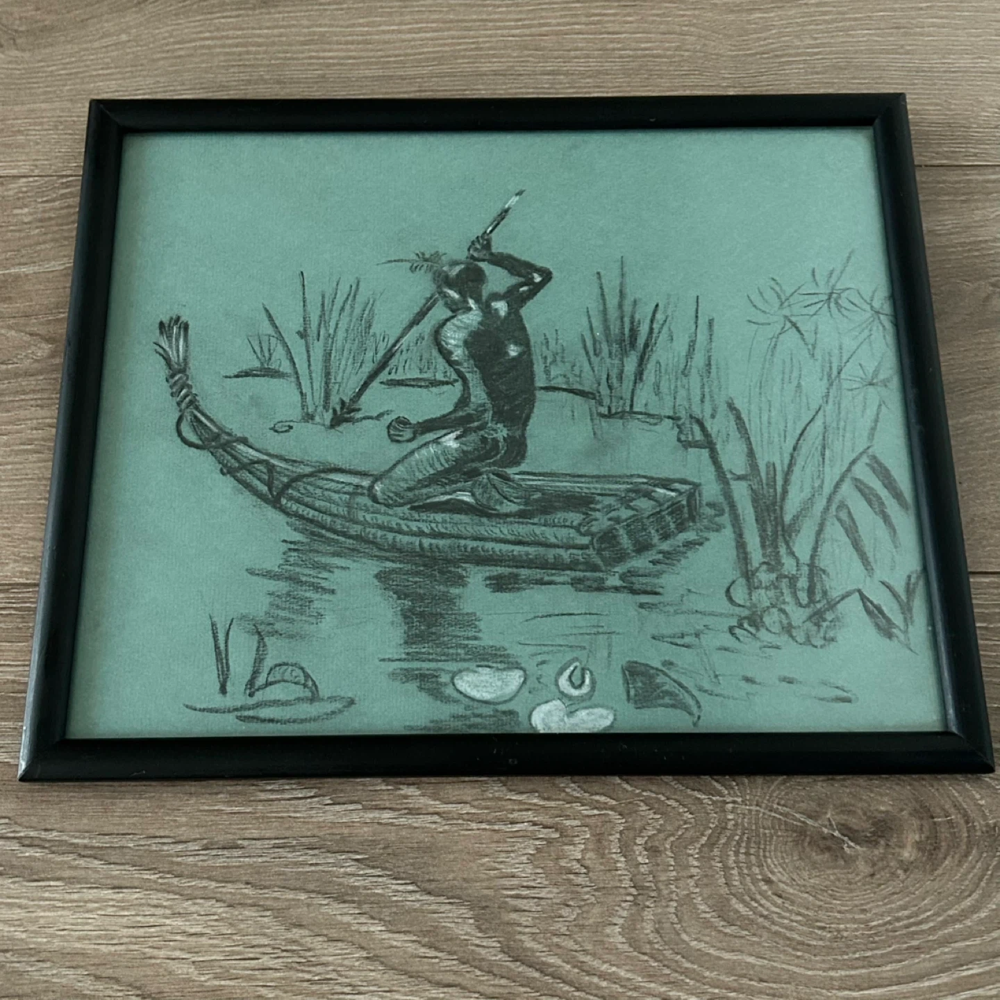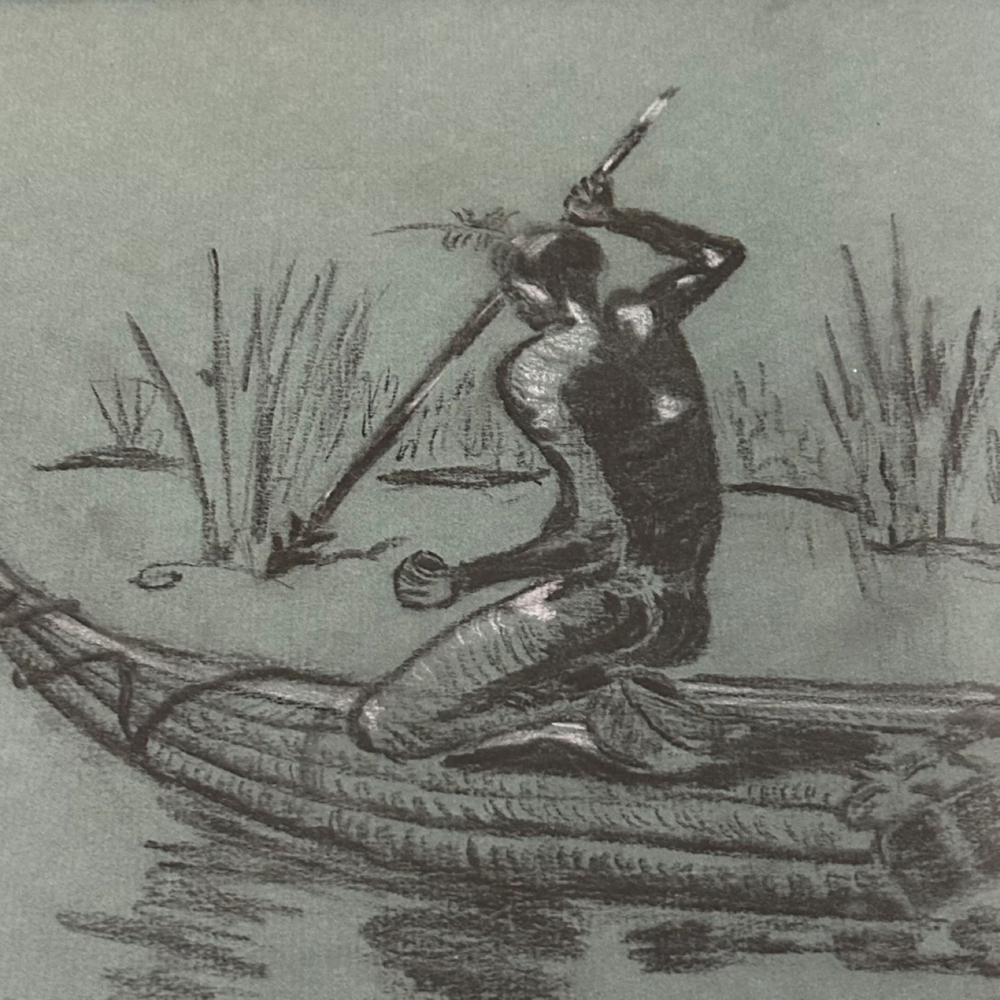 Striking vintage charcoal drawing with subtle white chalk highlights, executed on muted teal/green toned Canson & Montgolfier Ingres artist paper. The composition depicts a solitary figure navigating a traditional reed boat through papyrus plants and floating lily pads, creating a calm yet evocative river scene.