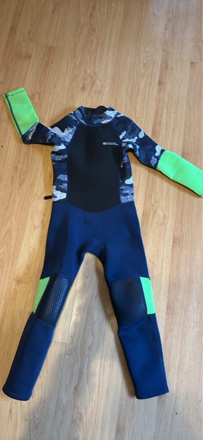 5-6 Years youth wetsuit. Blue camouflage and bright green accents. It has reinforced knee panels for durability.