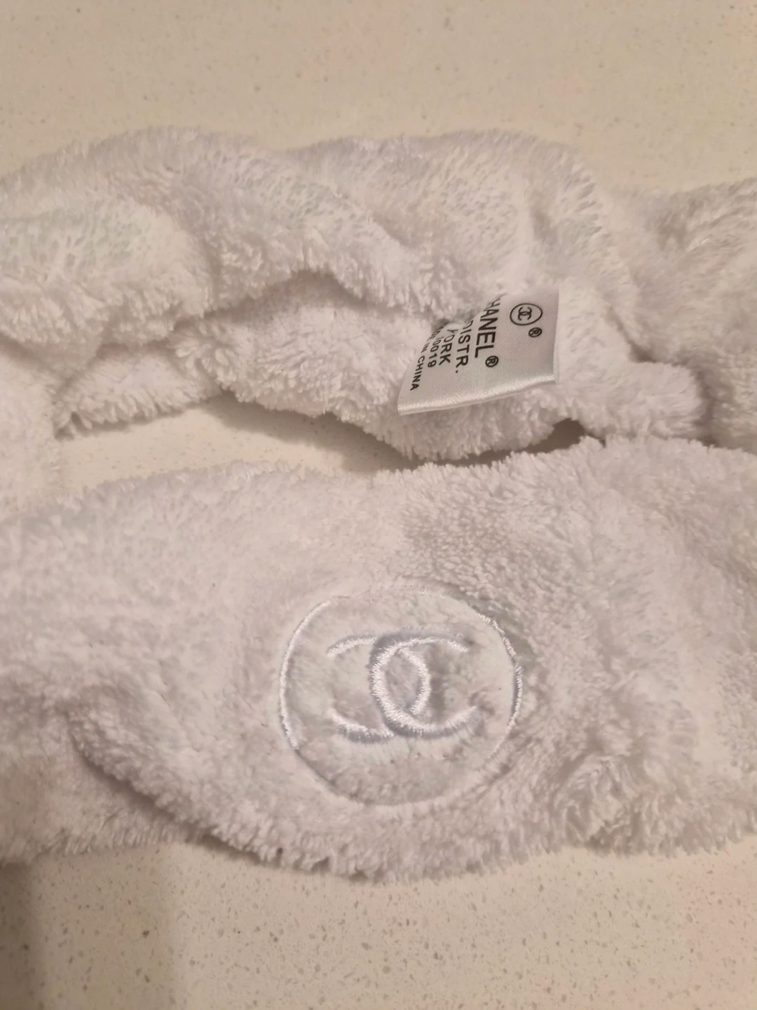 White terrycloth headband with embroidered CC logo. Soft and plush material. Made in China.