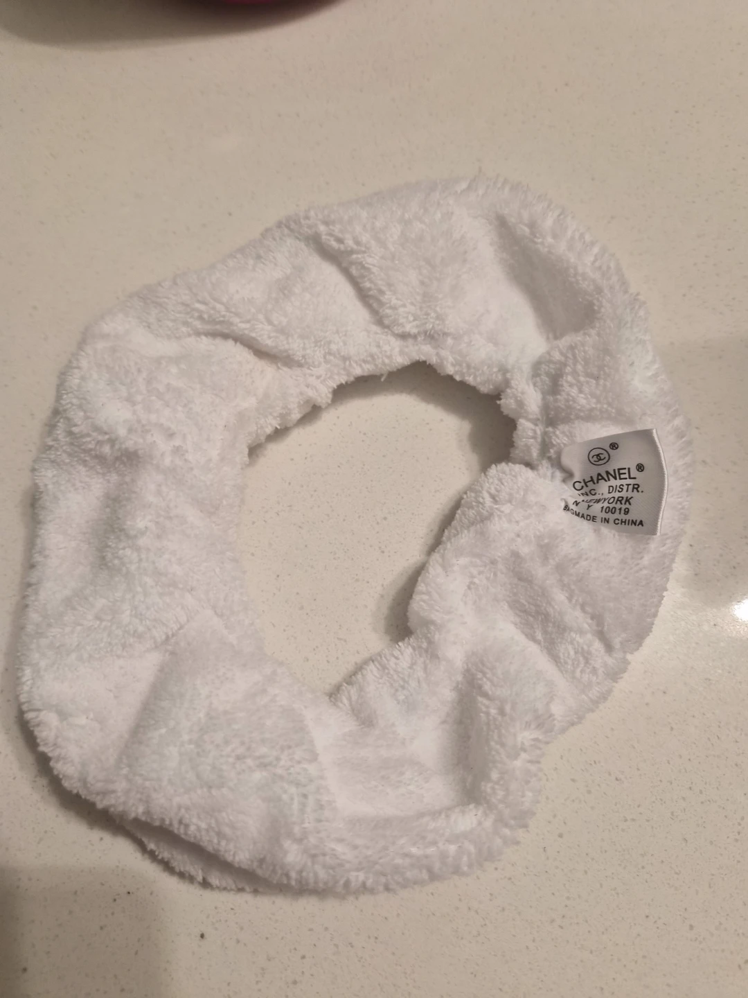 White terrycloth headband with embroidered CC logo. Soft and plush material. Made in China.