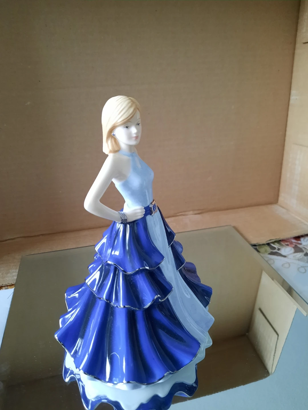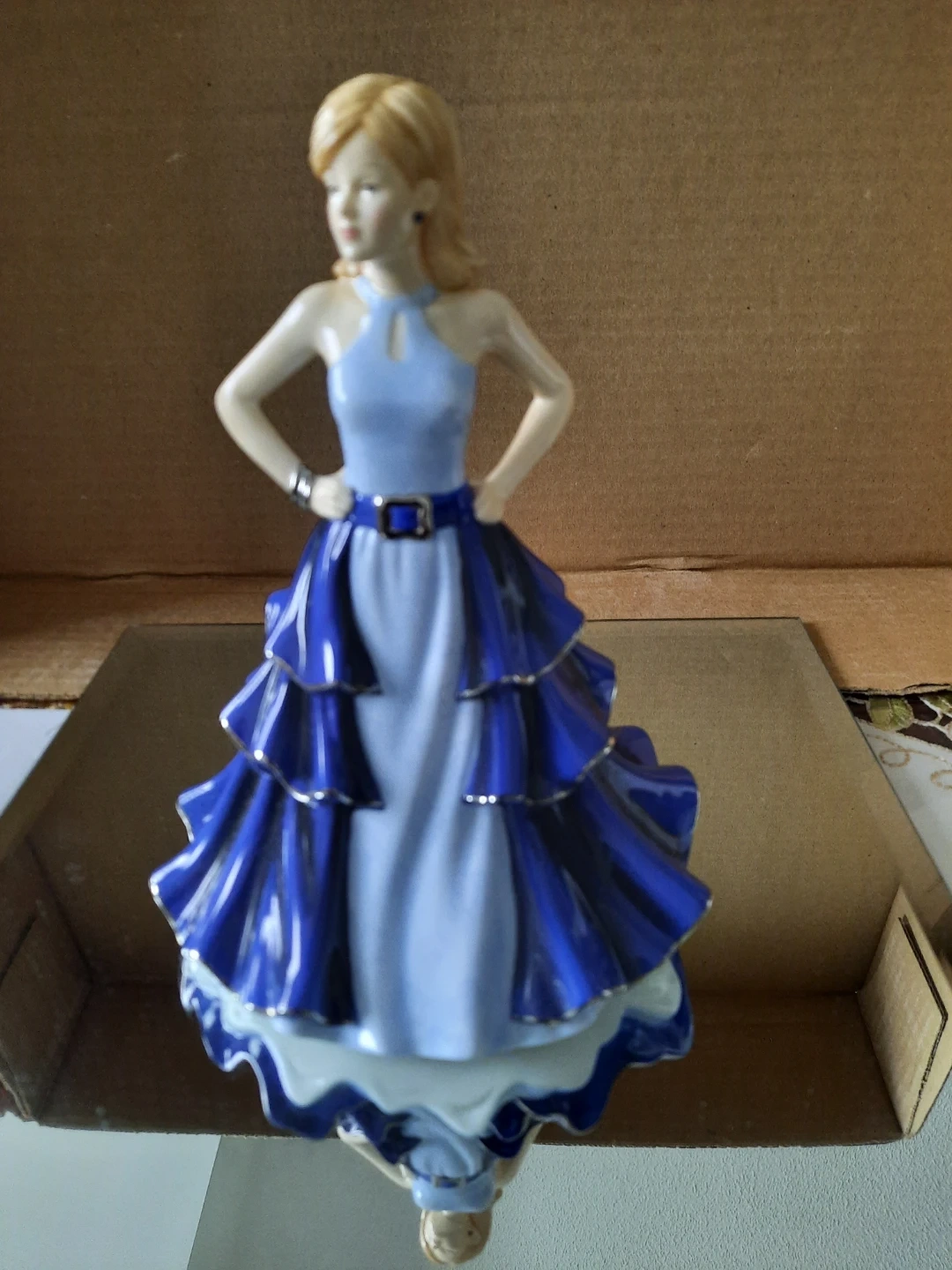 This Royal Doulton 'Pretty Ladies' figurine is titled 'Time To Celebrate'. It features a lady in a stunning blue ruffled gown. 7.5 inches tall..
