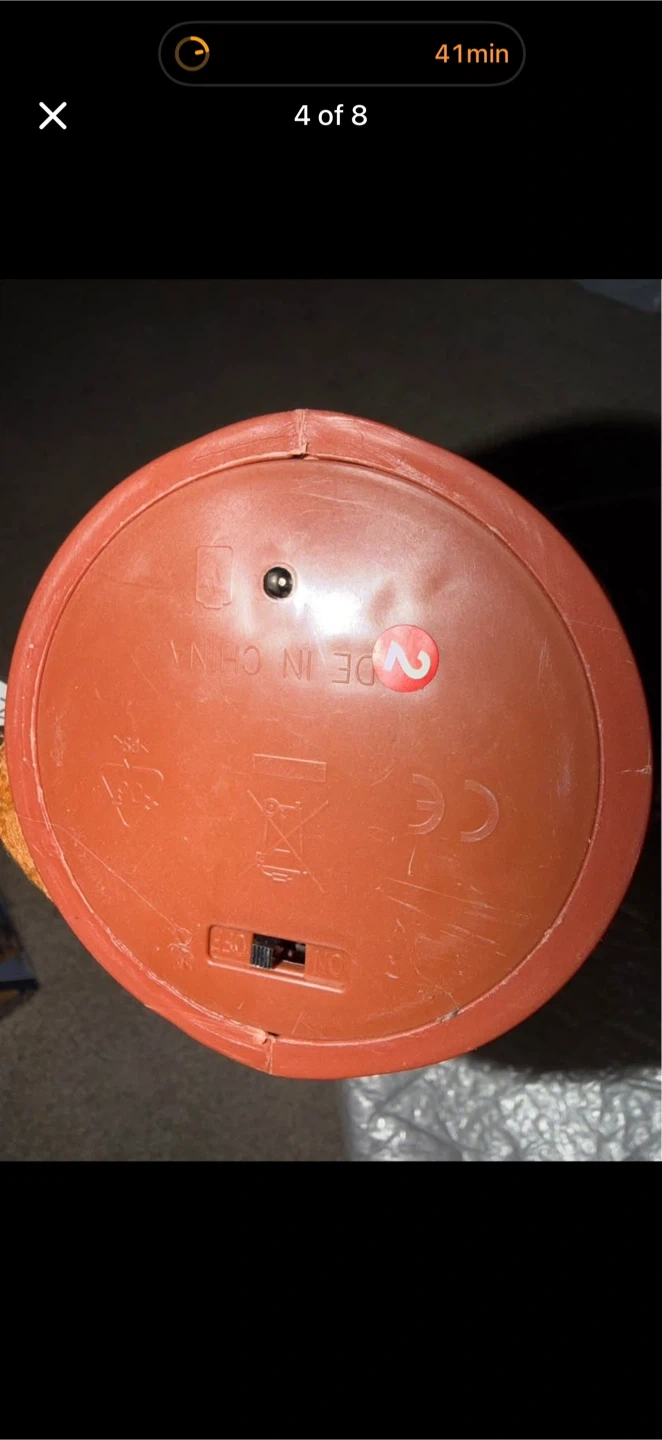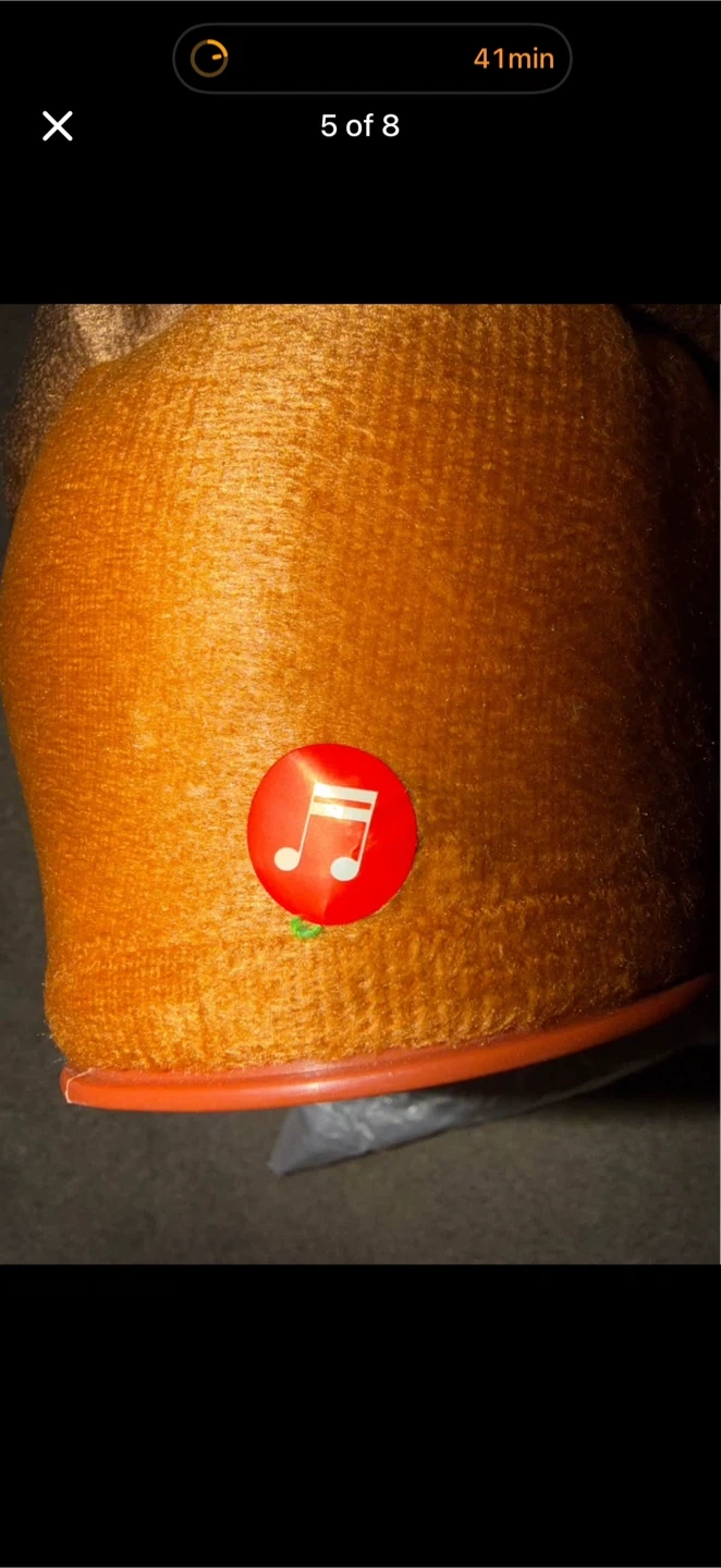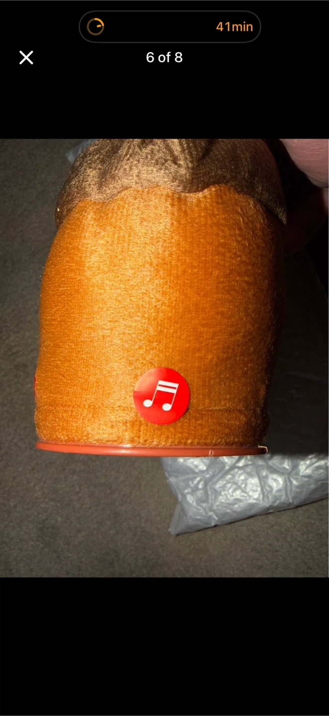 This is the MPETAPT Dancing Cactus toy that can sing and dance. It's made of knitted fabric and has googly eyes and a red smile. This toy is battery-operated and has an on/off switch on the bottom.