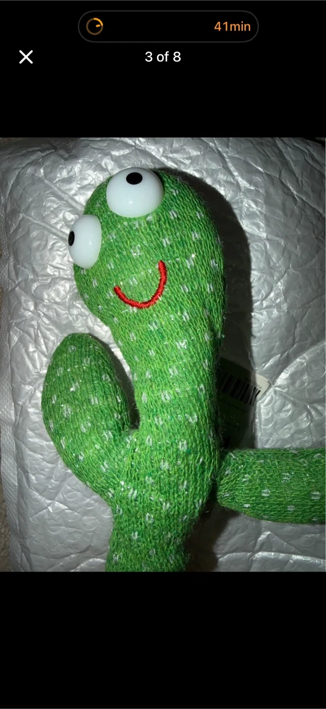 This is the MPETAPT Dancing Cactus toy that can sing and dance. It's made of knitted fabric and has googly eyes and a red smile. This toy is battery-operated and has an on/off switch on the bottom.