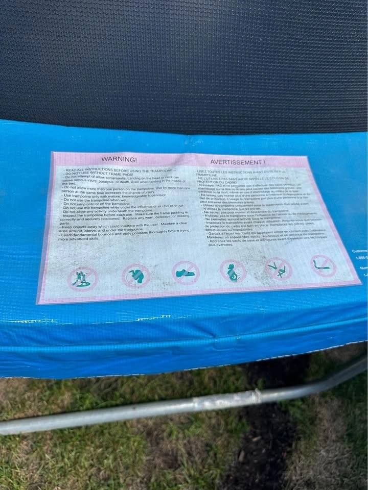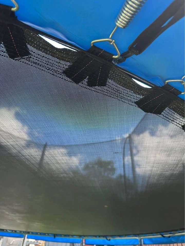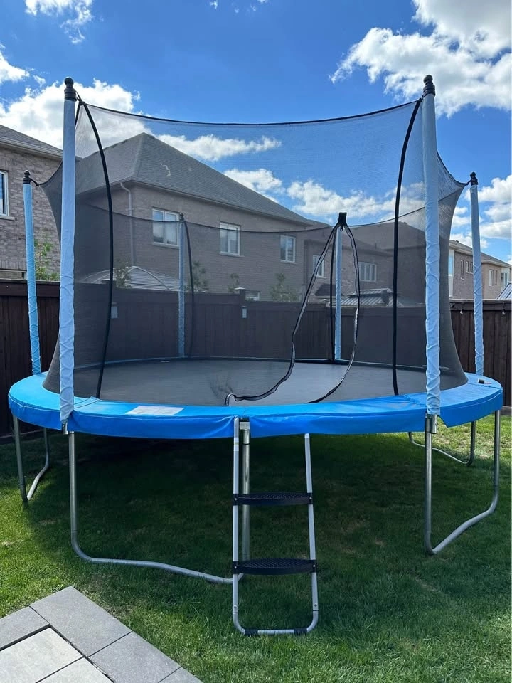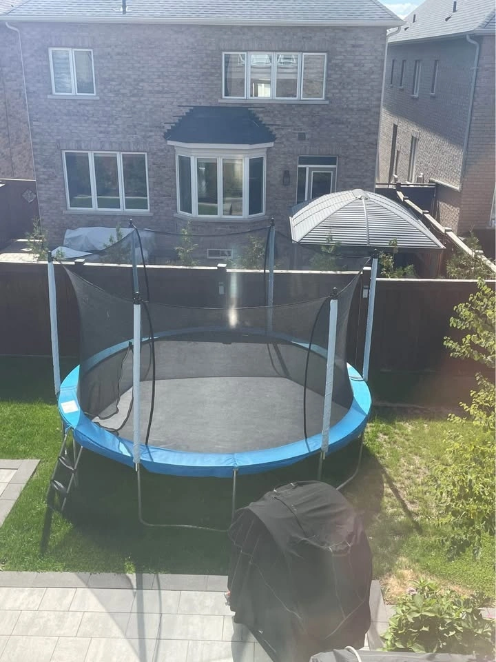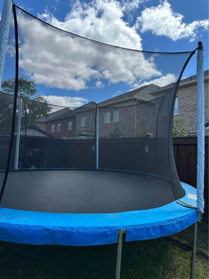 14ft Jump Trek trampoline in great condition, purchased from Canadian Tire about 4 years ago. Mesh poles, jump mat with springs were stored indoors every winter. No tears or rips on the jump mat or mesh. The photo shows one area where the blue pad is torn on the outside, but this does not affect the trampoline's use. A ladder is included and was purchased separately. Asking $200. We will dismantle it and have it ready for pick up in Woodbridge.