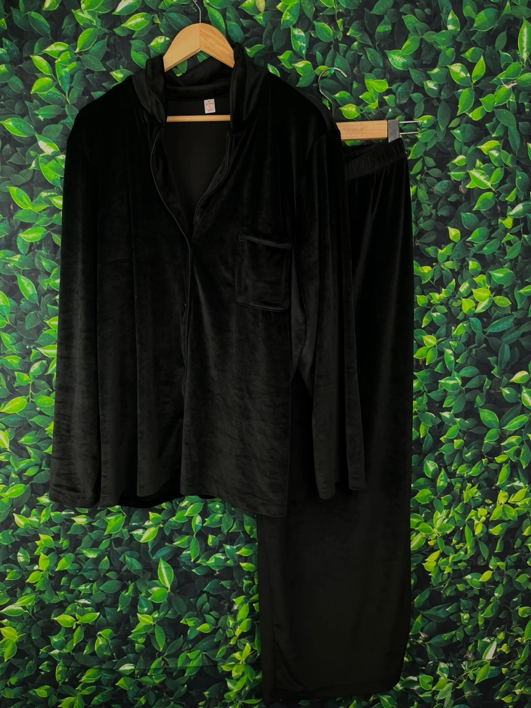 Cozy black velour pajama set. Includes a long-sleeve button-up top with a chest pocket and matching elastic-waist pants. Soft velour material for comfort.