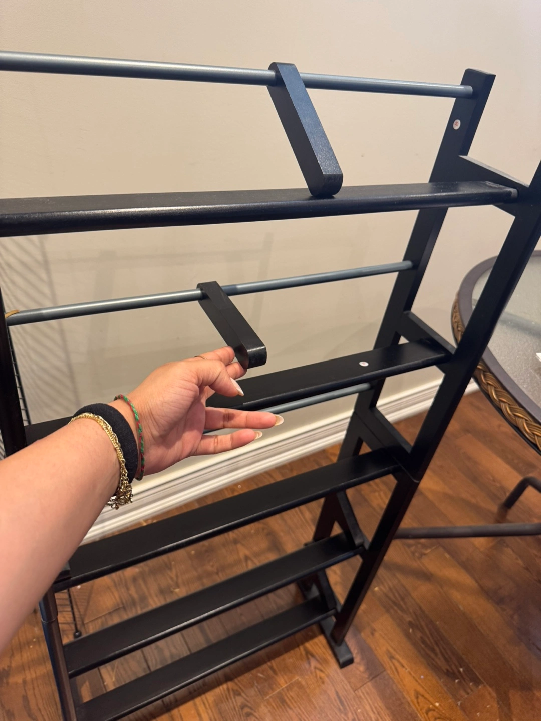 Two-piece storage solution. One is a freestanding metal rack, holds many discs. The other is a black wooden shelf unit with metal rods for organizing. Both great for media storage.