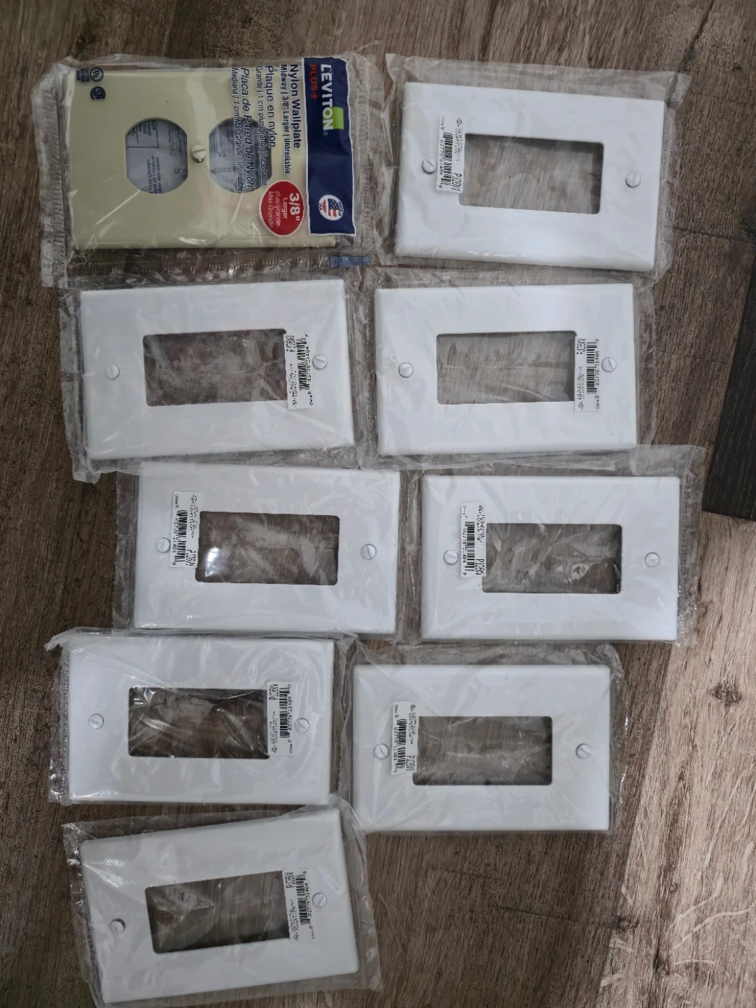 Nylon wall plates from Leviton. These are Midway, 3/8" larger, and unbreakable. Includes 8 plates.