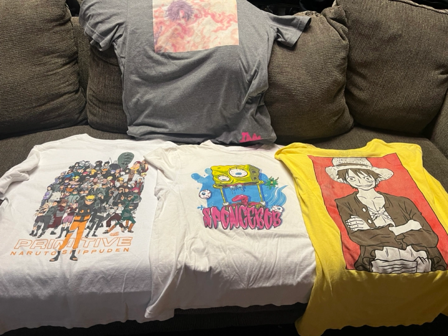 Four graphic t-shirts. Naruto Shippuden Primitive Brand M, SpongeBob Squarepants size M and One Piece Luffy size L designs. One grey abstract print tee anime size L. Pre-owned, sizes vary.