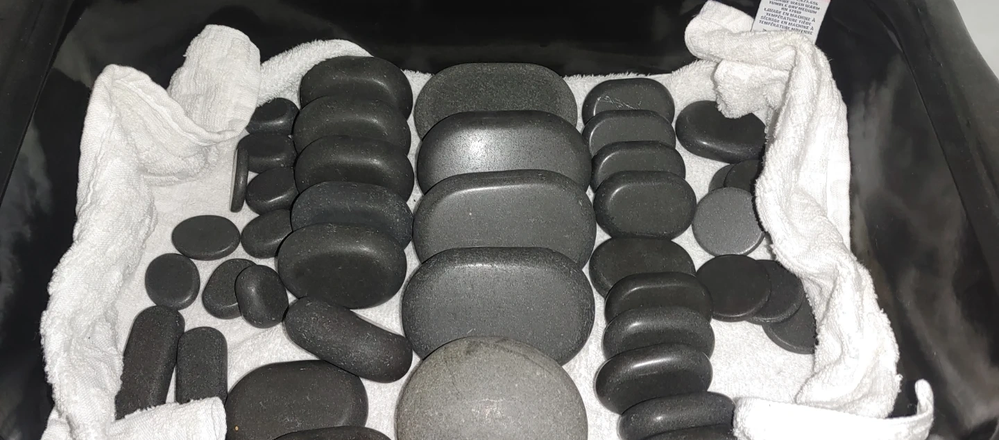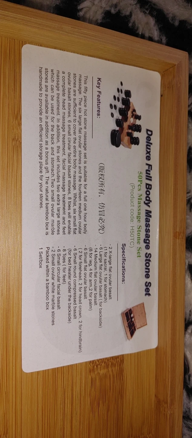 This is a Deluxe 50 Pcs Full Body Massage Stone Set. It includes various sizes of flat oval and round stones. The set comes with a natural bamboo box for storage. 15 Extra large stones
