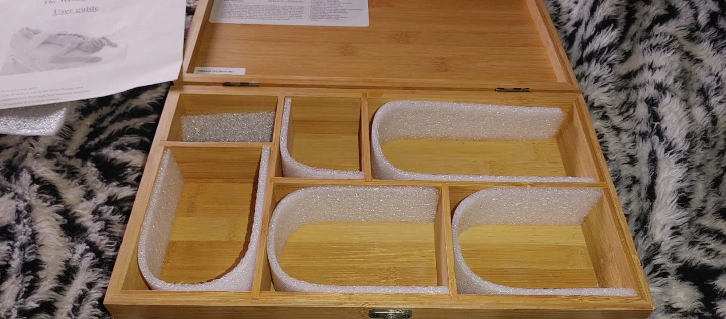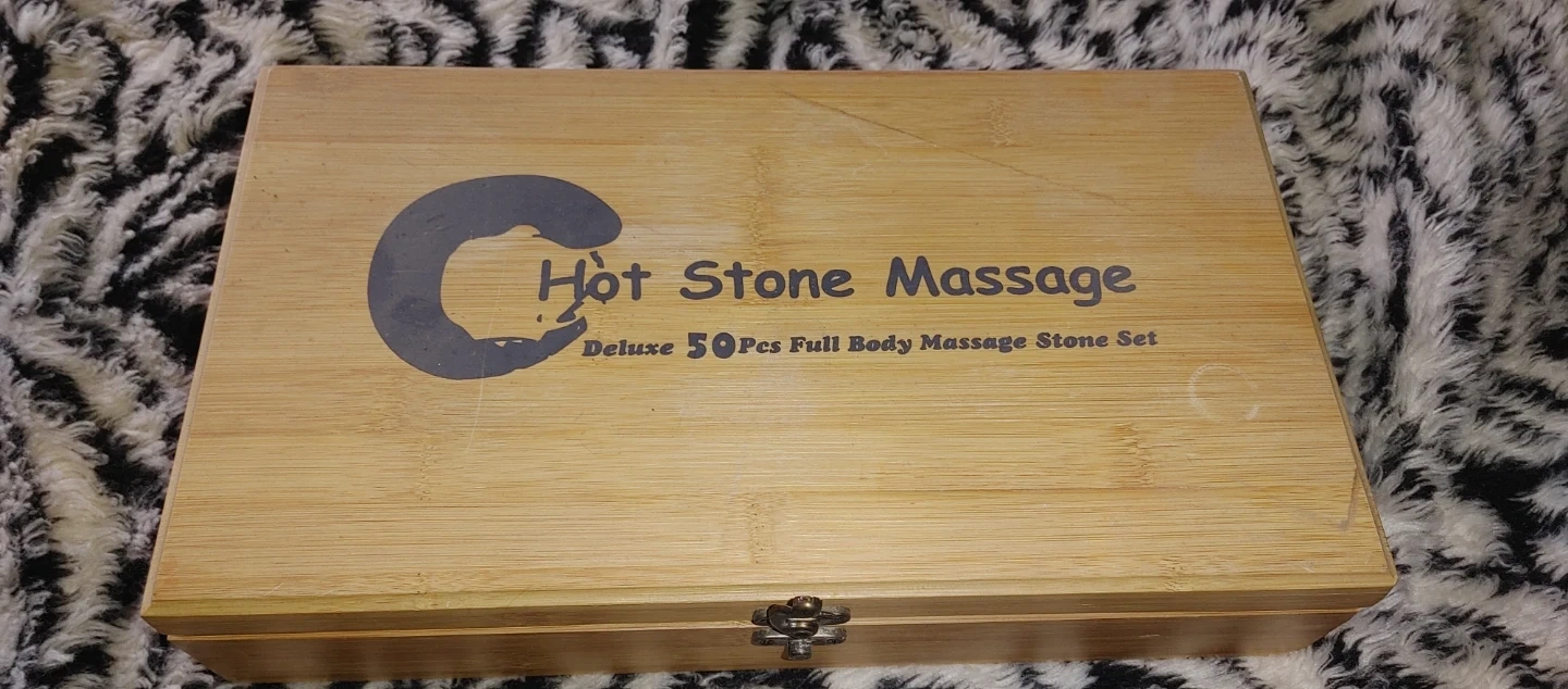 This is a Deluxe 50 Pcs Full Body Massage Stone Set. It includes various sizes of flat oval and round stones. The set comes with a natural bamboo box for storage. 15 Extra large stones